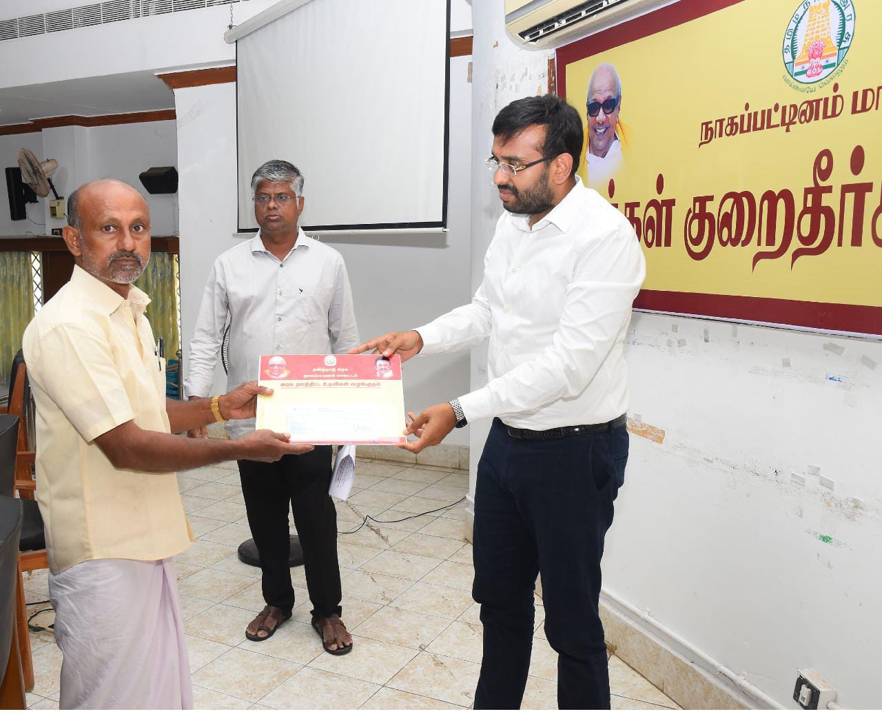 மேலும், நாகப்பட்டினம் நகராட்சி சூரியா நகரை சேர்ந்த சரஸ்வதி என்பவருக்கு ஆதார் அடையாள அட்டை பெறுவதற்கான ஆணை, வடக்குடி மேலத்தெருவை சேர்ந்த செல்வி, வடுகச்சேரி வடக்குத்தெரு கிராமத்தை சேர்ந்த அருண்மணி, நாகூர் மெயின்ரோடை சேர்ந்த நஜ்மா பேகம் ஆகிய பயனாளிகளுக்கு சமூக பாதுகாப்பு திட்டத்தின் கீழ் மாதந்திர உதவிதொகைக்கான ஆணை போன்றவைகளை மாவட்ட ஆட்சித்தலைவர் வழங்கினார்.