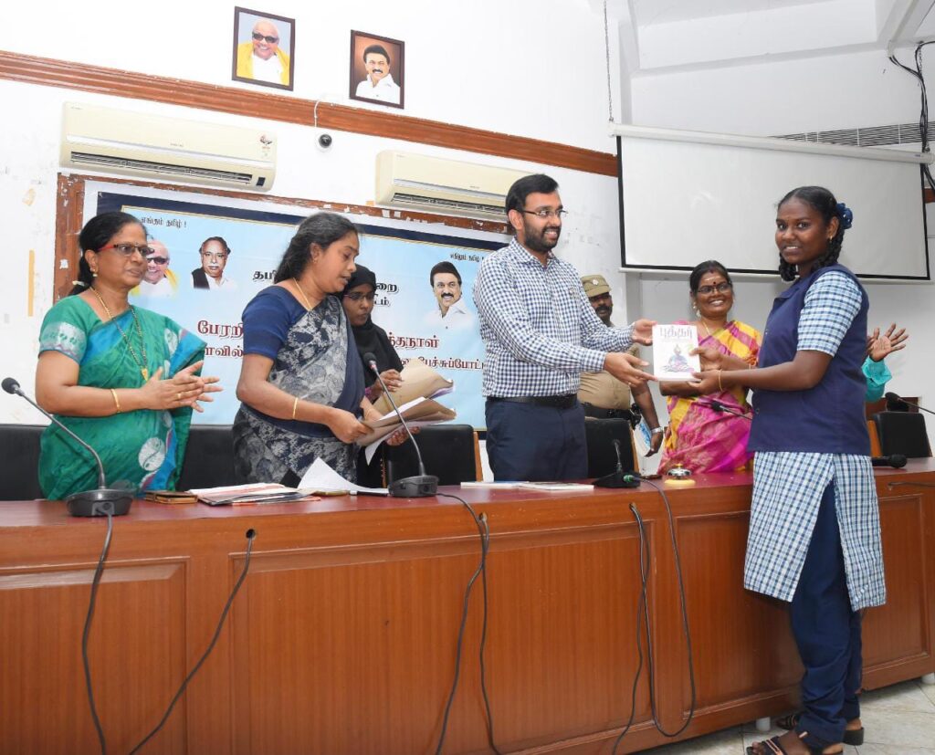 பின்னர் பள்ளி கல்லூரிகளுக்கிடையேயான பேச்சு போட்டிகளில் வெற்றி பெற்ற மாணவ, மாணவிகளுக்கு மாவட்ட ஆட்சித்தலைவர் அ.அருண்தம்புராஜ் பரிசுகளை வழங்கினார்.இந்நிகழ்ச்சியில் மாவட்ட ஆட்சியரின் நேர்முகக உதவியாளர்(பொது) சு.இராமன் மாவட்ட கல்வி அலுவலர் திருநாவுகரசு தமிழ்வளர்ச்சி துறை கண்காணிப்பாளர்(சென்னை) வசந்தகுமாரி ஆகியோர் கலந்து கொண்டனர்.
