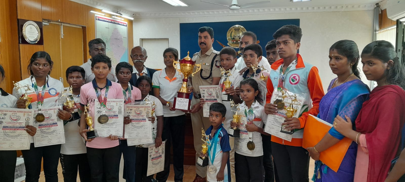 திருச்சியில் நடைபெற்ற போட்டியில் வெற்றிப்பெற்றவர்களுக்கும், மலேசியா சர்வதேச போட்டியில் தகுதி பெற்றவர்களுக்கும் பயிற்சியாளர் மணிகண்டன் ஆகியோருக்கு தூத்துக்குடி எஸ்.பி. பாலாஜி சரவணன் வாழ்த்து தெரிவித்து இனிப்பு வழங்கினார். மேலும், கோல்ட் ஸ்டார் அகாடமி மாணவர்கள் மலேசியாவில் நடைபெற உள்ள சர்வதேச அளவில் நடைபெறும் போட்டியில் வெற்றி பெறுவதற்கு வாழ்த்து தெரிவித்தார்.