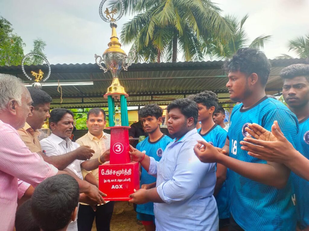 வேதாரணியம் அணி முதல் பரிசும் புஷ்பவனம் அணி இரண்டாம் பரிசும் அகஸ்தியன் பள்ளி அணி மூன்றாம் பரிசும் வானவன் மகாதேவி அணி நான்காம் பரிசு பெற்றனர். வெற்றி பெற்ற அணியினருக்கு வேதாரணியம் நகர்மன்ற உறுப்பினர் ராஜு,வேதாரணியம் சிறு உப்பு உற்பத்தியாளர்கள் இனணய செயலாளர் செந்தில் , ஐ என் டி யூ சி உப்பு தொழிலாளர்கள் சங்க துணைத் தலைவர் தங்கமணி ஆகியோர் ரொக்கப்பரிசு மற்றும் கோப்பையும் வழங்கினார்கள். போலீஸ் செய்தி டிவிக்காக நாகை மாவட்ட செய்தியாளர் எல்விஸ் லாய் மச்சோடா.
