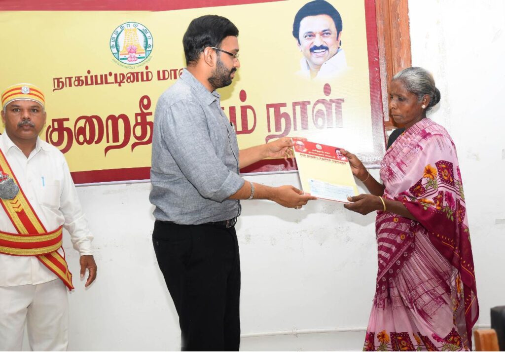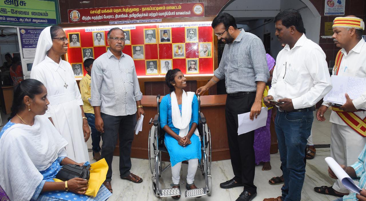 வாராந்திர மக்கள் குறைதீர்க்கும் நாள் கூட்டத்தில் வங்கிக் கடன் மற்றும் உதவித்தொகை, குடும்ப அட்டை, வேலைவாய்ப்பு, கல்வி உதவித் தொகை உள்ளிட்ட பல்வேறு கோரிக்கைகளை முன் வைத்து மொத்தம் 124 மனுக்கள் பெறப்பட்டுள்ளது. பெறப்பட்ட மனுக்கள் மீது விரைந்து நடவடிக்கை மேற்கொள்ள சம்பந்தப்பட்ட அலுவலர்களுக்கு மாவட்ட ஆட்சித்தலைவர் அவர்கள் அறிவுறுத்தினார்.அதனைத்தொடர்ந்து வாராந்திர மக்கள் குறைதீர்க்கும் நாள் கூட்டத்தில் திருக்குவளை வட்டம், அய்யனார் கோவில் தெரு, நத்தப்பள்ளம் என்ற முகவரியை சேர்ந்த இந்திரா வடிவழகன் என்பவருக்கு சுயதொழில் செய்வதற்காக மாவட்ட ஆட்சியர் தன்விருப்ப நிதியிலிருந்து ரூ.7,200 மதிப்பீட்டில் தையல் இயந்திரத்தையும், மாற்றுத்திறனாளிகள் நலத்துறை சார்பில் கொட்டாரக்குடி கிராமத்தை சேர்ந்த செல்வராணி என்ற மாற்றுத்திறனாளிக்கு ரூ.10,000 மதிப்பீட்டில் மடக்கு சக்கர நாற்காலியினை வேதாரண்யம் வட்டம், சுப்ரமணியன்காடு, தகட்டூர் கிராமத்தை சேர்ந்த சுப்ரமணியன் த/பெ நடேசன் என்பவர் சவுதி அரேபியா நாட்டில் இறந்ததற்காக தமிழக அரசிடமிருந்து வரப்பெற்ற இழப்பீடுத்தொகை ரூ.24,691-க்கான காசோலையினை அவரது மனைவி ரேவதி என்பவரிடமும் மாவட்ட ஆட்சித்தலைவர் வழங்கினார்.