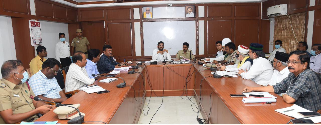 நாகப்பட்டினம் அக்டோபர் 26 நாகப்பட்டினம் மாவட்ட ஆட்சியர் அலுவலகத்தில் நாகூர் தர்காவில் நடைபெற உள்ள கந்தூரி விழாவை முன்னிட்டு முன்னேற்பாடு பணிகள் குறித்து மாவட்ட ஆட்சித் தலைவர் அ.அருண்தம்புராஜ் தலைமையில், மாவட்ட காவல் கண்காணிப்பாளர் கு.ஜவகர் முன்னிலையில் நடைபெற்றது. கூடுதல் ஆட்சியர் (வளர்ச்சி) ம.பிரதிவிராஜ் நாகப்பட்டினம் சார் ஆட்சியர் பானோத் ம்ருகேந்தர் லால் ஆகியோர் உடன் உள்ளனர்.