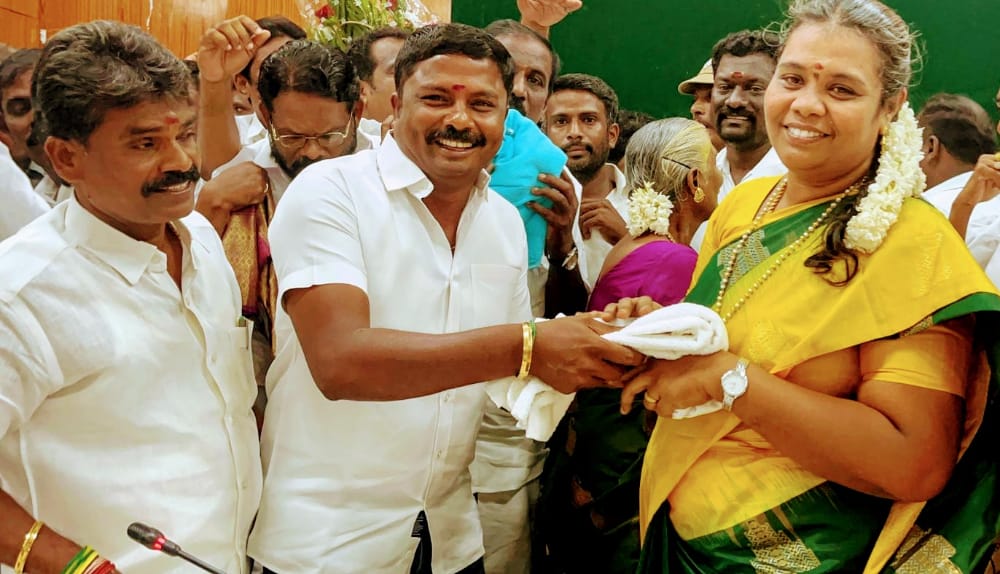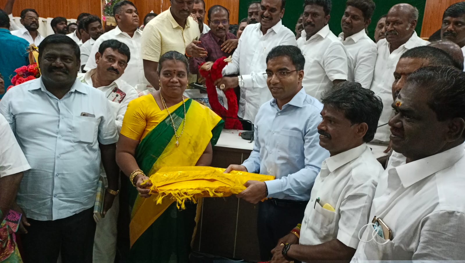 கலெக்டர் செந்தில்ராஜ் தலைமையில் நடைபெற்ற மறைமுக தேர்தலில் வேறுயாரும் போட்டியிடாததால் பிரம்மசக்தி போட்டியின்றி தேர்வு செய்யப்பட்டதாக அறிவிக்கப்பட்டு, பூங்கொத்து கொடுத்து வாழ்த்து தெரிவித்தார்.
