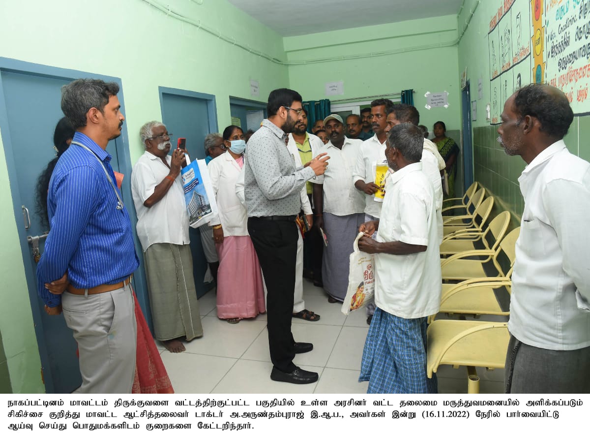 நாகப்பட்டினம் மாவட்டம் திருக்குவளை வட்டத்திற்குட்பட்ட பகுதியில் உள்ள அரசினர் வட்ட தலைமை மருத்துவமனையில் உள்ள கண் சிகிச்சைப்பிரிவு , சித்தா பிரிவு, பொது மருத்துவ பிரிவு, இரத்த அழுத்தம் மற்றும் சர்க்கரை பரிசோதனை மையம், மகப்பேறு மையத்தினையும், நவீன சமையல் கூடத்தினையும் மற்றும் வம்சம் திட்டம் செயல்படுவது குறித்தும் மாவட்ட ஆட்சித்தலைவர் அ.அருண்தம்புராஜ் நேரில் பார்வையிட்டு ஆய்வு மேற்கொண்டார். இந்த ஆய்வின் போது மாவட்ட ஆட்சியர் தெரிவித்ததாவது