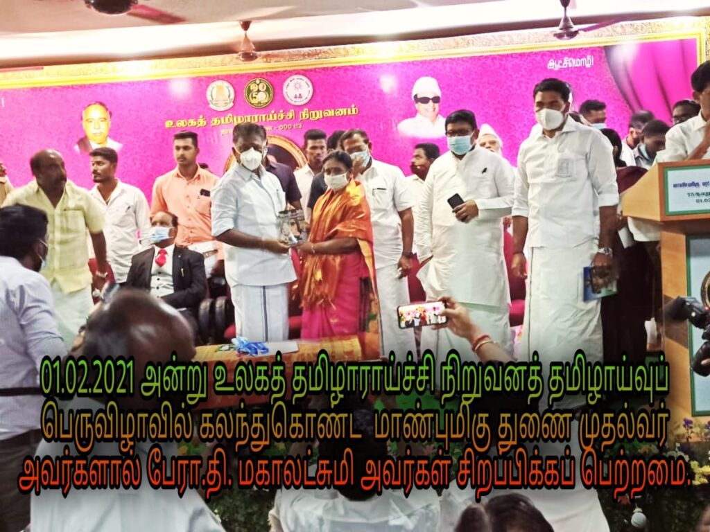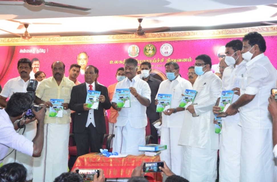 மாண்புமிகு தமிழ்நாடு துணை முதலமைச்சர் – திரு .ஓ.பன்னீர்செல்வம் அவர்கள் , திருக்கரங்களால் தமிழ்த்தாய் 73 – தமிழாய்வுப் பெருவிழாவில் “பொன்விழா மலர் புத்தகம்” வெளியிடப்பட்டது. உடன் மாண்புமிகு தமிழ் ஆட்சி மொழி, தமிழ்ப்பண்பாடு மற்றும் தொல்லியல்துறை அமைச்சர் – திரு.க.பாண்டியராஜன் அவர்கள் , தமிழ் வளர்ச்சி இயக்குநர் முனைவர் கோ.விசயராகவன் அவர்கள் பொறுப்பாளர் திருமதி டாக்டர் மகாலட்சுமி மற்றும் அலுவலர்கள் , நிகழ்ச்சி விருந்தினர்கள். கலந்து கொண்டனர் இந்தத் தொடர் நிகழ்ச்சியாக நேற்று முன் தினம் உலகத் தமிழாராய்ச்சி நிறுவனம் திருமூலர் ஆய்வு இருக்கையின் 6ம் ஆண்டு தொடக்கவிழா பேரறிஞர் அண்ணா கருத்தரங்குக் கூடத்தில் வைத்து 23.2.2021 அன்று நடைபெற்றது.
