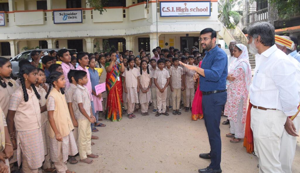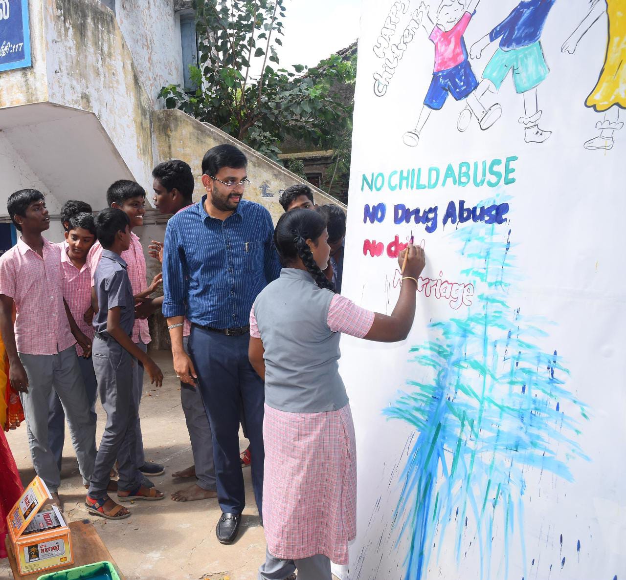 அதனைத் தொடர்ந்து நாகப்பட்டினம் நகராட்சியில் உள்ள சி.எஸ்.ஐ உயர்நிலைப்பள்ளி மாணவர்கள் வர்ணம் தீட்டி பெண்களுக்கு எதிரான வன்முறைகள் ஒழிப்பு குறித்து விழிப்புணர்வு ஏற்படுத்தியதை மாவட்ட ஆட்சித் தலைவர் டாக்டர் அ.அருண்தம்புராஜ் பார்வையிட்டு, விழிப்புணர்வு ஏற்படுத்திய மாணவர்களுக்கு பரிசு பொருட்களை வழங்கினார்.