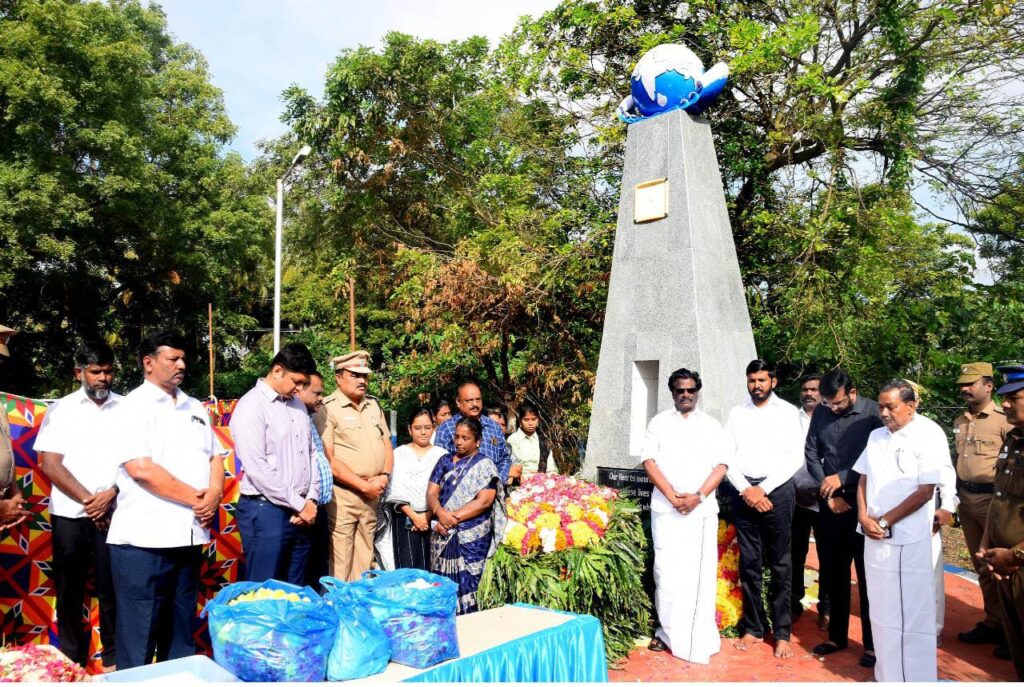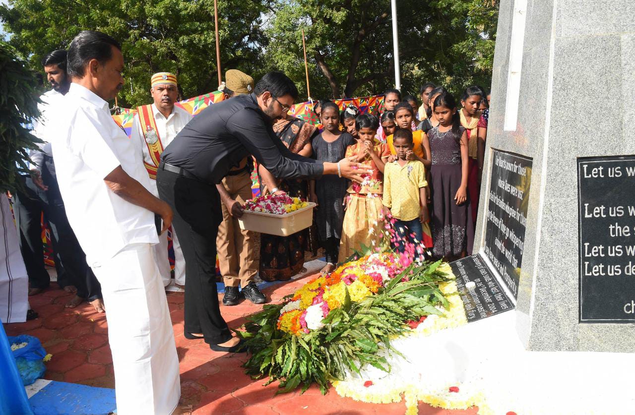 மலர் வளையம் வைத்து அஞ்சலி செலுத்தினார்கள். தொடர்ந்து, கடந்க 2004 ஆம் ஆண்டு ஏற்பட்ட சுனாமியால் பெற்றோர்களை இழந்த குழந்தைகள் தங்கி பயிலும் அன்னை சத்யா அரசு குழந்தைகள் காப்பகத்தில் உள்ள குழந்தைகள் மெழுகுவர்த்தி ஏந்தி அஞ்சலி செலுத்தினார்கள்.