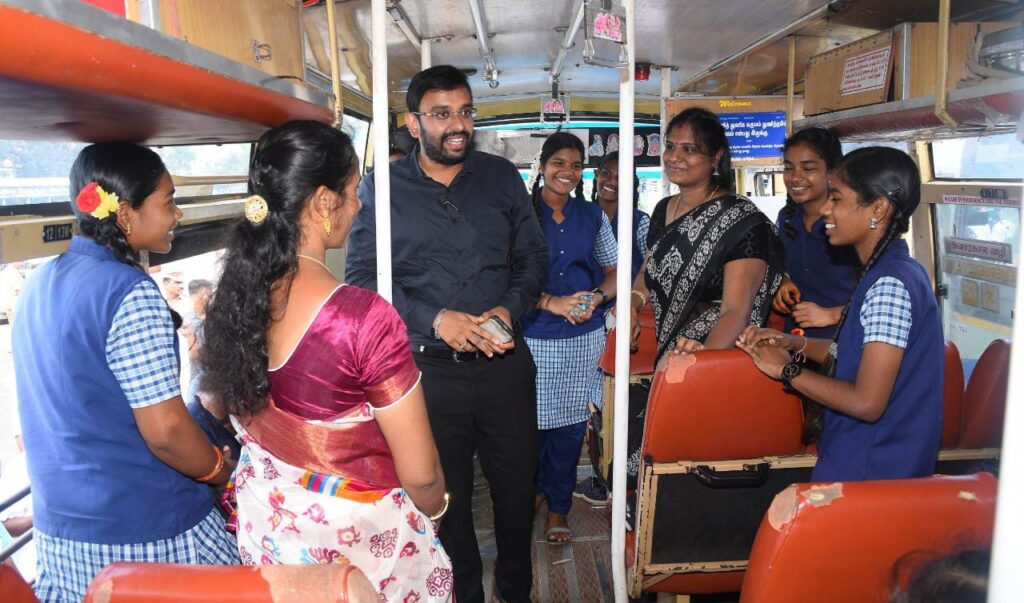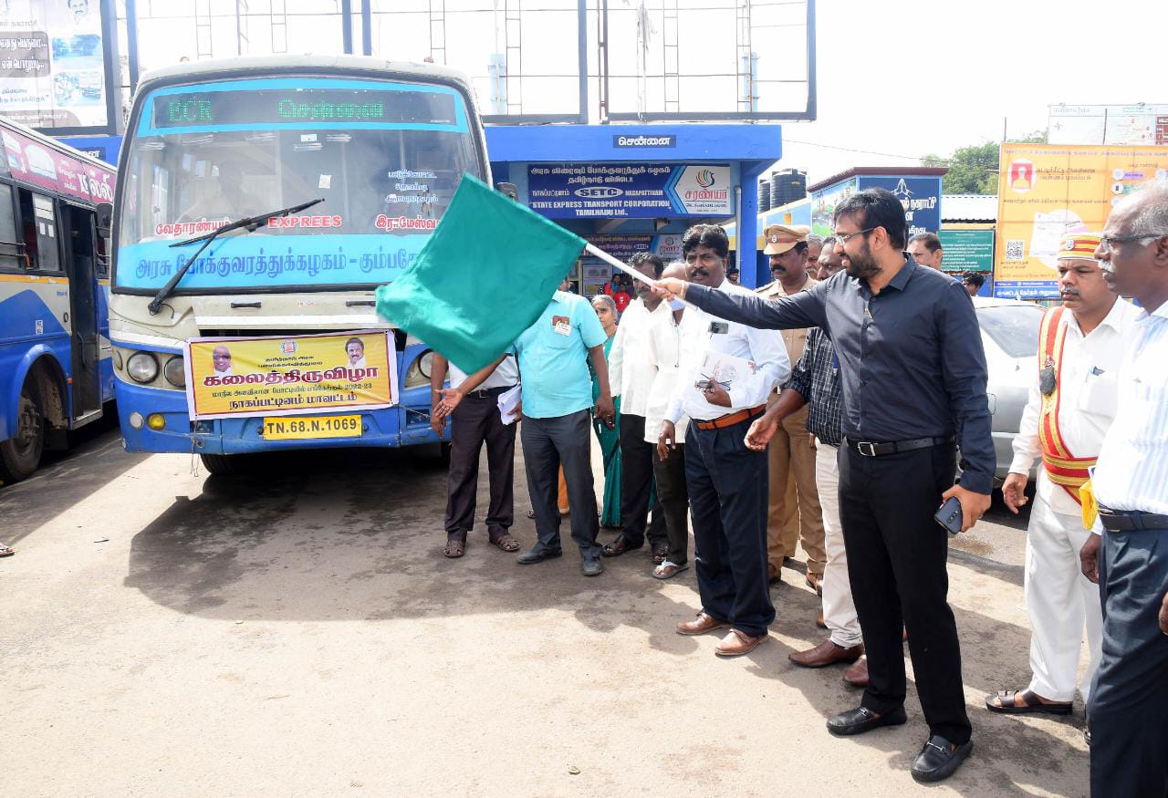 நாகப்பட்டினம் புதிய பேருந்து நிலையத்தில் பள்ளிக்கல்வித்துறை சார்பில் மாநில அளவில் நடைபெறவுள்ள கலைத்திருவிழாவில் பங்கேற்க செல்லும் மாணவ-மாணவியர்களின் பேருந்துகளை மாவட்ட ஆட்சித்தலைவர் டாக்டர்; அ.அருண்தம்புராஜ் கொடியசைத்து தொடங்கி வைத்தார்.