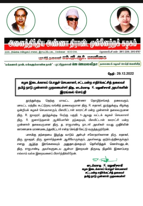 அதில் அவர் தெரிவித்துள்ளதாவது: தூத்துக்குடி தெற்கு மாவட்ட அண்ணா தொழிற்சங்கத் தலைவரும், மாவட்ட மத்திய கூட்டுறவு வங்கித் தலைவருமான ஆர்.சுதாகர், தூத்துக்குடி கிழக்கு ஒன்றிய கழக செயலாளரும், மீளவிட்டான் ஊராட்சி மன்ற முன்னாள் தலைவருமான ஆர்.ஜவஹர், தூத்துக்குடி மேற்கு பகுதி 1வது வட்ட கழகச் செயலாளர் ஆர்.ஜனார்த்தனன் ஆகியோரின் தந்தையும், மீளவிட்டான் ஊராட்சி மன்ற முன்னாள் தலைவருமான த.ராஜபாண்டி நாடார் அவர்கள் வயது முதிர்வின் காரணமாக மரணமடைந்து விட்டார் என்ற செய்தி கேட்டு வருத்தமுற்றேன்.