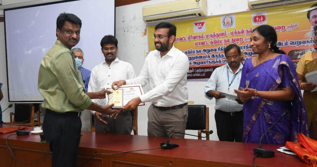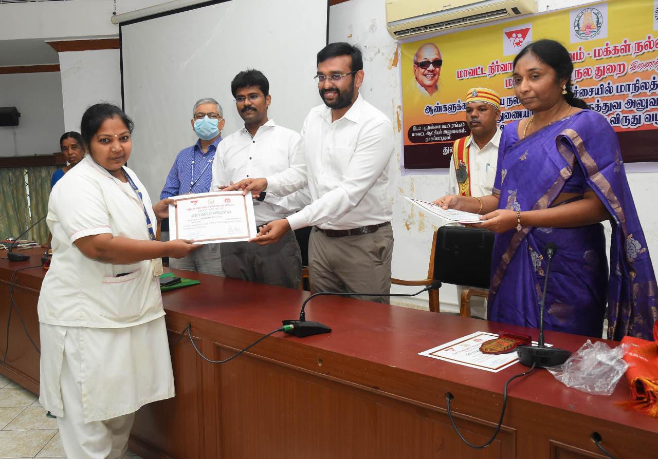 நாகப்பட்டினம் மாவட்ட குடும்ப நல செயலகம் சார்பாக ஆண்களுக்கான குடும்ப நல அறுவை சிகிச்சையில் எண்ணிக்கை சாதனை செய்து முதல் இடம் பிடிப்பதற்கு உறுதுணையாக இருந்த மருத்துவ அலுவலர்கள் மற்றும் அரசு அலுவலர்களை பாராட்டி பாராட்டு சான்றிதழ் மற்றும் கேடயங்களை வழங்கினார்.