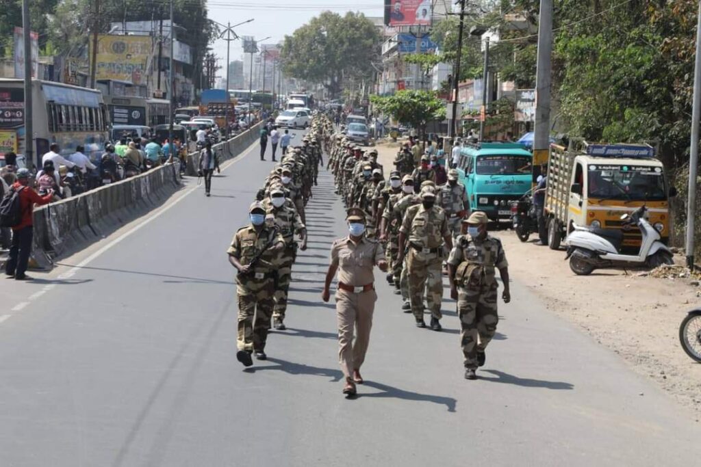 2021-தமிழக சட்டப்பேரவை தேர்தலை முன்னிட்டு நேற்று மத்திய தொழிற்பாதுகாப்பு படையினர் மற்றும் மாவட்ட காவல் துறையினர் , ஊர்க்காவல் படையினர் இணைந்து மாவட்ட காவல்துறை சார்பில் கொடி அணிவகுப்பு நடத்தப்பட்டது .