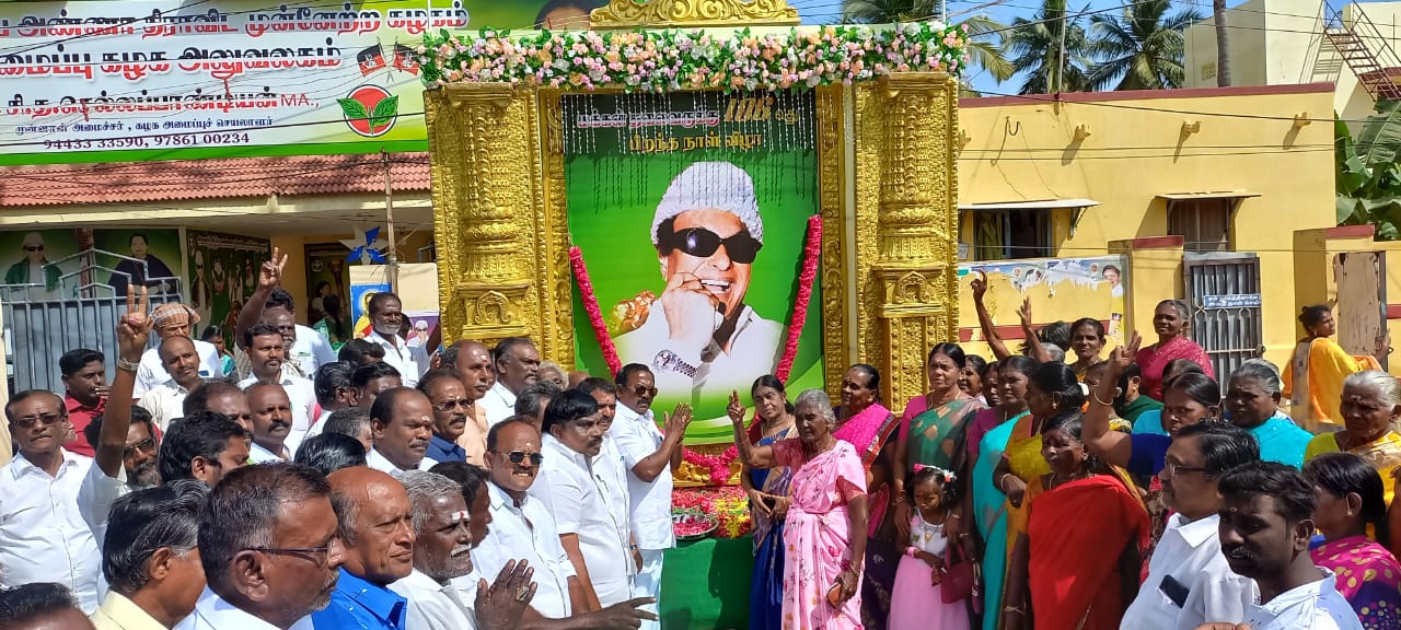 எம்.ஜி.ஆர் 106வது ஆண்டு பிறந்த நாளை முன்னிட்டு சிதம்பரநகர் நான்காவது தெருவில் உள்ள அதிமுக அமைப்பு கழகம் முன்பு அலங்கரித்து வைக்கப்பட்டிருந்து எம்.ஜி.ஆர் படத்திற்கும் பின்னர் பழைய மாநகராட்சியில் உள்ள சிலைக்கு அதிமுக அமைப்பு செயலாளரும் முன்னாள் அமைச்சருமான சி.த செல்லப்பாண்டியன் தலைமையில் மாலை அணிவித்து மரியாதை செய்து இனிப்பு வழங்கினார்.