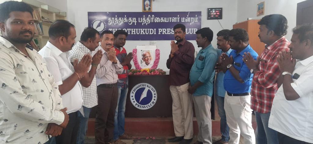 இதனையடுத்து, தூத்துக்குடி பத்திரிக்கையாளர் மன்றம் சார்பில், தூத்துக்குடி பத்திரிக்கையாளர் மன்ற அலுவலகத்தில் அவரது திருஉருவப்படத்திற்கு மலர்தூவி அஞ்சலி செலுத்தப்பட்டது.