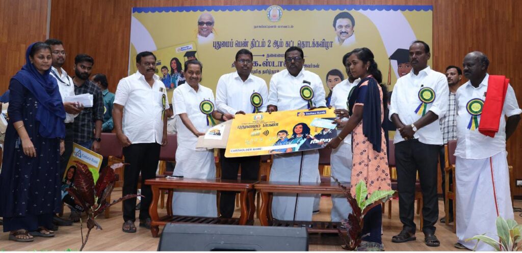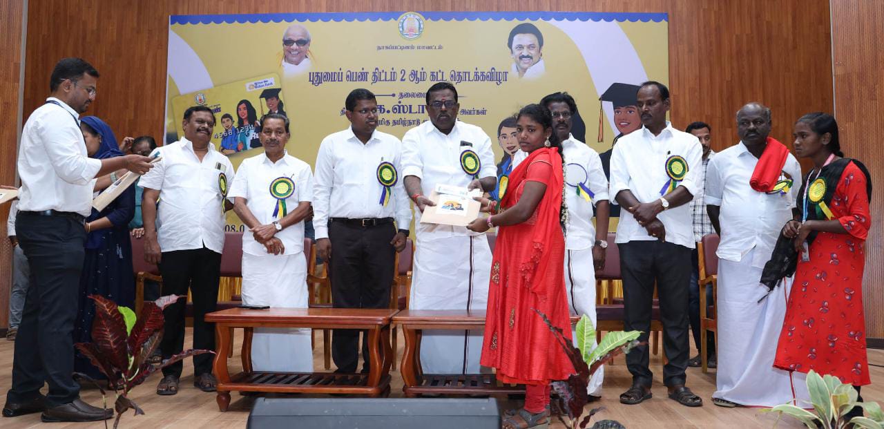 மாண்புமிகு தமிழ்நாடு முதலமைச்சர் அவர்கள் உயர்கல்வி பயிரும் மாணவிகளுக்கு மாதம் ரூ.1000 கல்வி உதவித்தொகை வழங்கும் திட்டத்தை 05.09.2022 அன்று துவக்கி வைத்தார். இத்திட்டத்திற்கு புதுமைபெண் திட்டம் என தமிழ்நாடு அரசு பெயர் சூட்டியுள்ளது. அதனைத் தொடர்ந்து இன்று திருவள்ளுர் மாவட்டத்தில் புதுமைப்பெண் திட்டத்தின் 2 ஆம் கட்ட தொடக்க விழாவை துவக்கி வைத்தார். அதனைத் தொடர்ந்து நாகப்பட்டினம் மாவட்டத்தில் சமூகநலன் மற்றும் மகளிர் உரிமைத்துறை சார்பில் மூவலூர் இராமாமிர்தம் அம்மையார் நினைவு புதுமைபெண் திட்டத்தில் உயர்கல்வி பயிலும் மாணவிகளுக்கு மாதம் ரூ.1000 கல்வி உதவித்தொகை பெறுவதற்கான வங்கி பற்று அட்டை 49 கல்லூரிகளில் படிக்கும் 1603 மாணவிகளுக்கு வழங்கப்பட்டது.