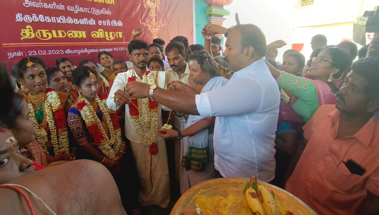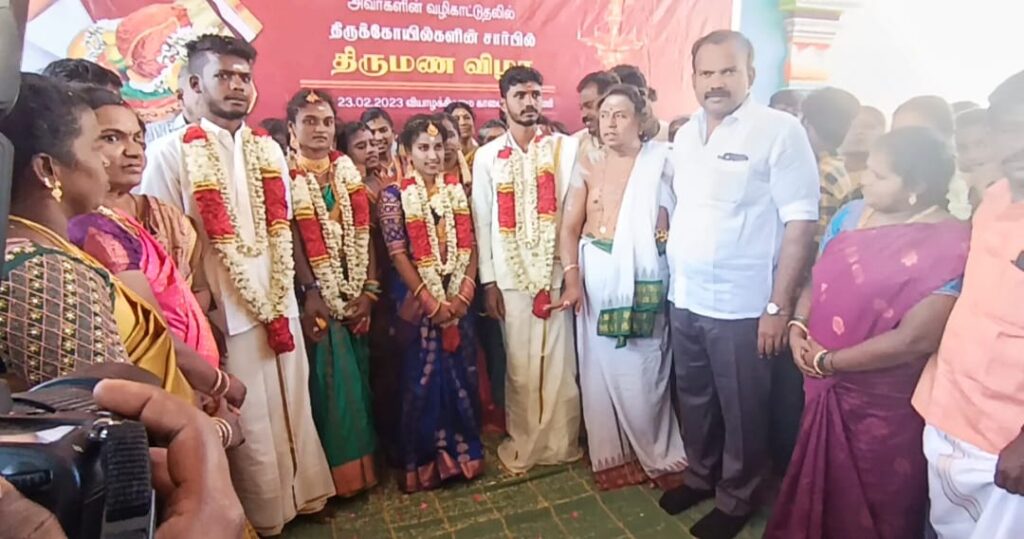 தூத்துக்குடி சங்கர ராமேஸ்வரர் உடனுறை பாகம்பிரியாள் (சிவன் கோவில்) உள் கலையரங்கில் வைத்து சரவணக்குமார் – சிவலெட்சுமி, கருப்பசாமி பாண்டியன்-நிரஞ்சனா ஆகிய இரு ஜோடிகளுக்கு இந்து சமய அறநிலையத்துறை விதிமுறைகளின் ஹோமம் குண்டம் வளர்த்து கோவில் தலைமை அர்ச்சகர் கல்யாண சுந்தரம் என்ற செல்வம் பட்டர் தலைமையில் மந்திரங்கள் கூற மணமக்களுக்கு மாங்கல்யத்தை தூத்துக்குடி மாநகராட்சி மேயர் ஜெகன் பெரியசாமி வழங்கினார். மங்கள வாத்தியம் மற்றும் கெட்டி மேளம் முழங்க இரு ஜோடிகளுக்கு திருமணம் நடைபெற்றது.