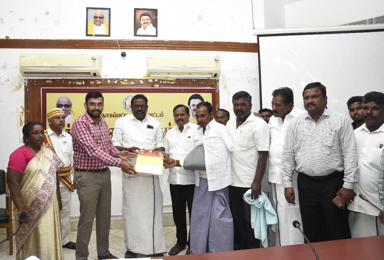 நாகப்பட்டினம் மாவட்டம் நம்பியார்நகர் மீனவ கிராமத்திலிருந்து நாட்டுப்படகில் மீன்பிடிக்க சென்ற மீனவர்கள் மீது இலங்கை நாட்டைச் சேர்ந்த நபர்களால் தாக்கப்பட்டு படுகாயமுற்ற மீனவருக்கு முதலமைச்சர் பொது நிவாரண நிதியிலி;ருந்து ரூ.50,000 க்கான நிவாரணத்தொகையினை மாவட்ட ஆட்சித்தலைவர் டாக்டர் அ.அருண்தம்புராஜ், மற்றும் மீன்வளர்ச்சி கழக தலைவர் என்.கௌதமன் ஆகியோர் இன்று வழங்கினர்.