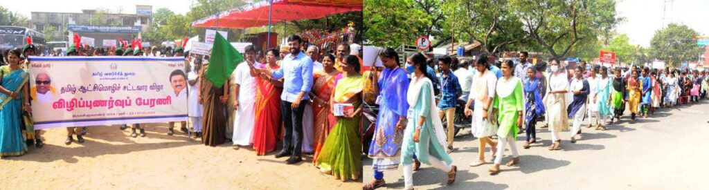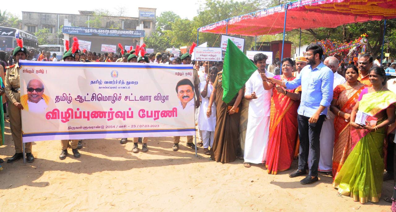 மேலும், வணிக நிறுவனங்களின் பெயர்ப்பலகைகள் தமிழில் அமைத்திடுவதற்கான விழிப்புணர்வு ஏற்படுத்தும் வகையில் அவுரித்திடல் முதல் அரசு மருத்துவமனை, அண்ணாசாலை, தேரடி, கடைத்தெரு, நாலுகால் மண்டபம் வழியாக இந்து சமய அறநிலையத்துறை இணை ஆணையர் அலுவலகம் வரையிலான கல்லூரி மாணவ, மாணவி;களின் விழிப்புணர்வு பேரணியினை மாவட்ட ஆட்சித்தலைவர் தமிழ் வாழ்க என முழக்கமிட்டு தொடங்கி வைத்தார்.
