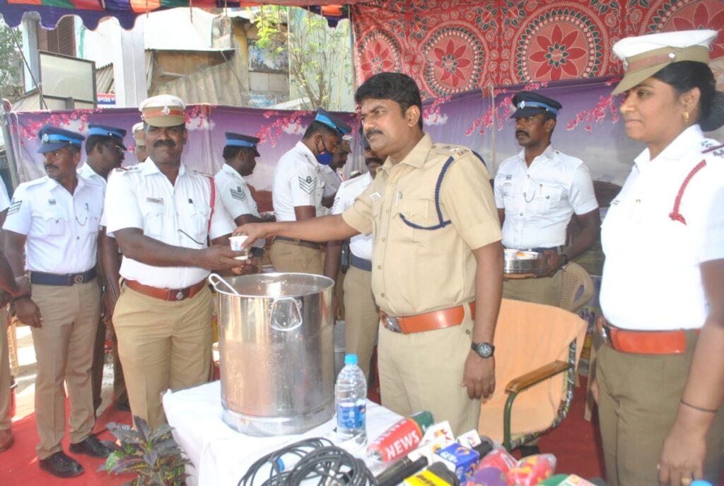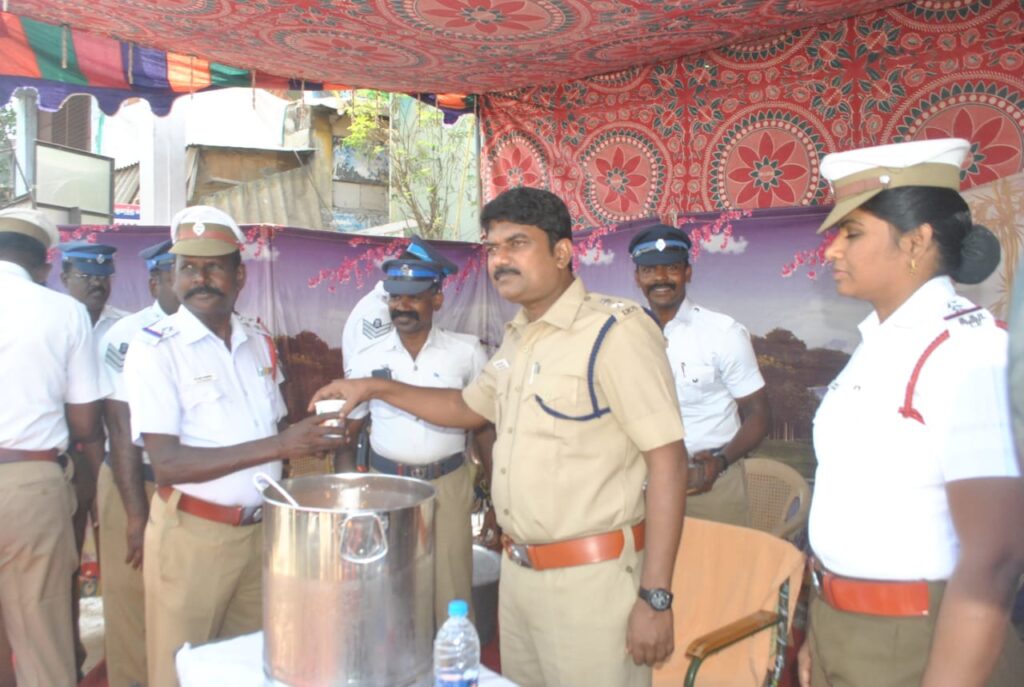கோடை வெப்பத்தையும் பொருட்படுத்தாமல் வாட்டி வதைக்கும் வெயிலில் போக்குவரத்து போலீசார் பணியில் ஈடுபடுகின்றனர். கொடூர வெயிலை கண்டுகொள்ளாமல் பணி செய்யும் போக்குவரத்து போலீசாருக்கு குளிர்பானங்கள் வழங்குவதற்கு நெல்லை மாநகர காவல் ஆணையாளர் அன்பு அவர்கள் உத்தரவின் பெயரில் நெல்லை மாநகர போக்குவரத்து மற்றும் குற்ற பிரிவு துணை ஆணையாளர் மகேஷ்குமார் அவர்கள கோடை வெயிலை சமாளிக்க நெல்லையில் போக்குவரத்து போலீசாருக்கு மோர், மற்றும் பழ ஜூஸ் வழங்கினார் .