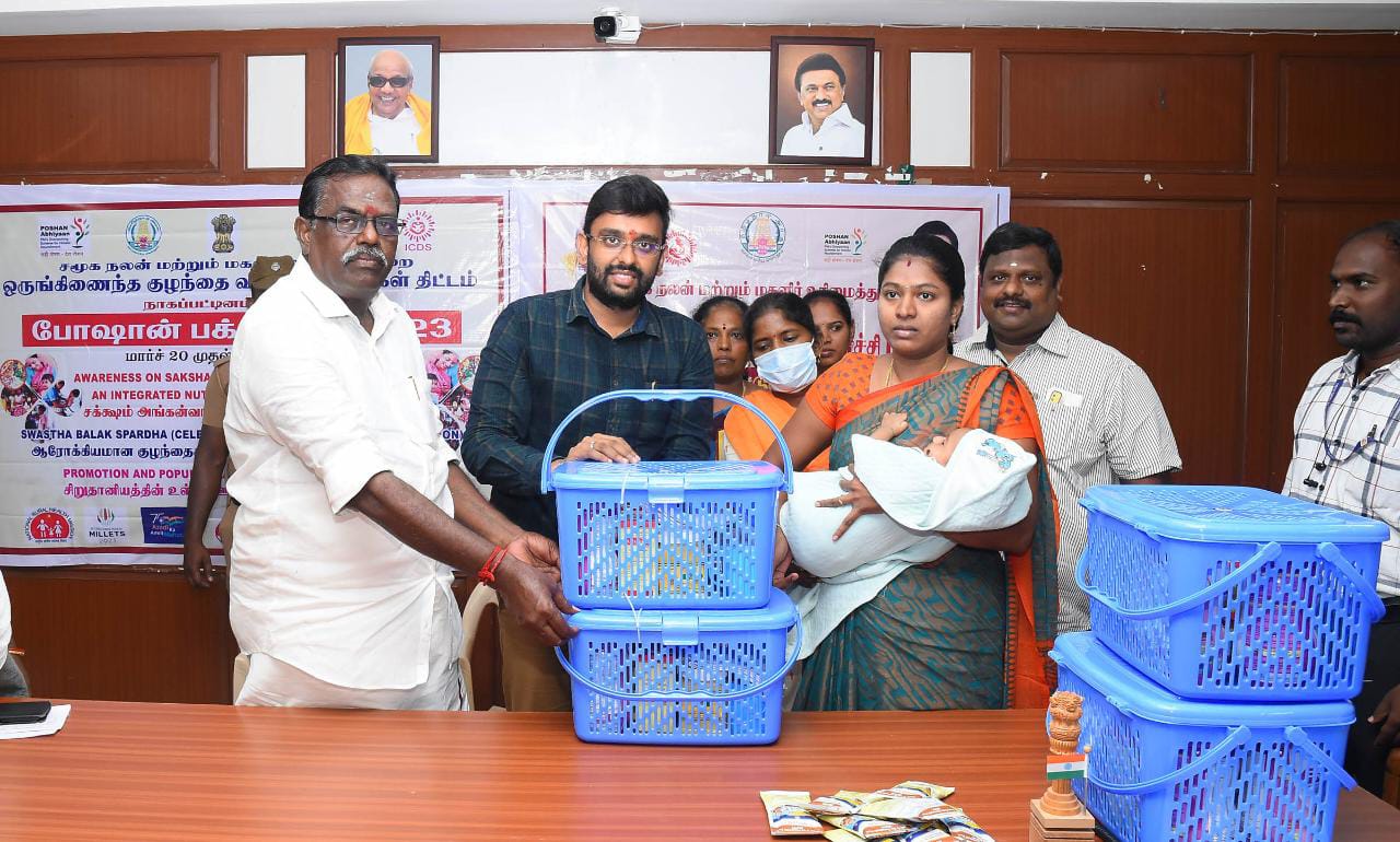 நாகப்பட்டினம் மாவட்ட ஆட்சியர் வளாகத்தில் ஒருங்கிணைந்த குழந்தை வளர்ச்சித் திட்ட பணிகள் சார்பில் “ஊட்டச்சத்தை உறுதிசெய்” திட்டத்தின் கீழ் ஊட்டச்சத்து குறைபாடுள்ள குழந்தைகளுக்கு சிறப்பு ஊட்டச்சத்து வழங்கும் திட்டத்தினை மாவட்ட ஆட்சித்தலைவர் துவங்கி வைத்தார்.