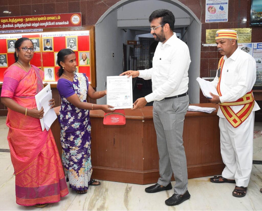 நாகப்பட்டினம் மாவட்ட ஆட்சியர் அலுவலகத்தில்மக்கள் குறைதீர்க்கும் நாள் கூட்டம் மாவட்ட ஆட்சித்தலைவர் டாக்டர் அ.அருண்தம்புராஜ் தலைமையில் இன்று நடைபெற்றது.வாராந்திர மக்கள் குறைதீர்க்கும் நாள் கூட்டத்தில் வங்கிக் கடன் மற்றும் உதவித்தொகை, குடும்ப அட்டை, வேலைவாய்ப்பு, கல்வி உதவித் தொகை உள்ளிட்ட பல்வேறு கோரிக்கைகளை முன் வைத்து மொத்தம் 203 மனுக்கள் பெறப்பட்டுள்ளது. பெறப்பட்ட மனுக்கள் மீது விரைந்து நடவடிக்கை மேற்கொள்ள சம்பந்தப்பட்ட அலுவலர்களுக்கு மாவட்ட ஆட்சித்தலைவர் அறிவுறுத்தினார்.அதனைத்தொடர்ந்து வாராந்திர மக்கள் குறைதீர்க்கும் நாள் கூட்டத்தில் மாற்றுத்திறனாளி நலத்துறை சார்பில் பெருங்கடம்பனூர் ஊராட்சியைச் சார்ந்த பாரதிதாசன் த/பெ வீராச்சாமி என்பவர் மற்றும் வாசுகி த/பெ பிச்சை ஆகிய இருவருக்கும் அளிக்கப்பட்ட மனுவிற்கு உடனடி தீர்வாக ரூ.9,150 மதிப்பீட்டில் மூன்று சக்கர சைக்கிளையும், 3 மாற்றுத்திறனாளிகளுக்கு மாற்றுத்திறனாளிக்கான பாதுகாவலர் நியமன சான்றிதழ்களையும், சமூக பாதுகாப்புத்திட்டத்தின் சார்பில் மாற்றுத்திறனாளிகள் உதவித்தொகை திட்டத்தின் கீழ் நாகப்பட்டினம் வட்டம் ஆலங்குடி கிராமத்தைச் சேர்ந்த தனலெட்சுமி என்பவருக்கு மாதாந்திர மாற்றுத்திறனாளி உதவித்தொகைக்கான ஆணையினையும் மாவட்ட ஆட்சித்தலைவர் வழங்கினார்.