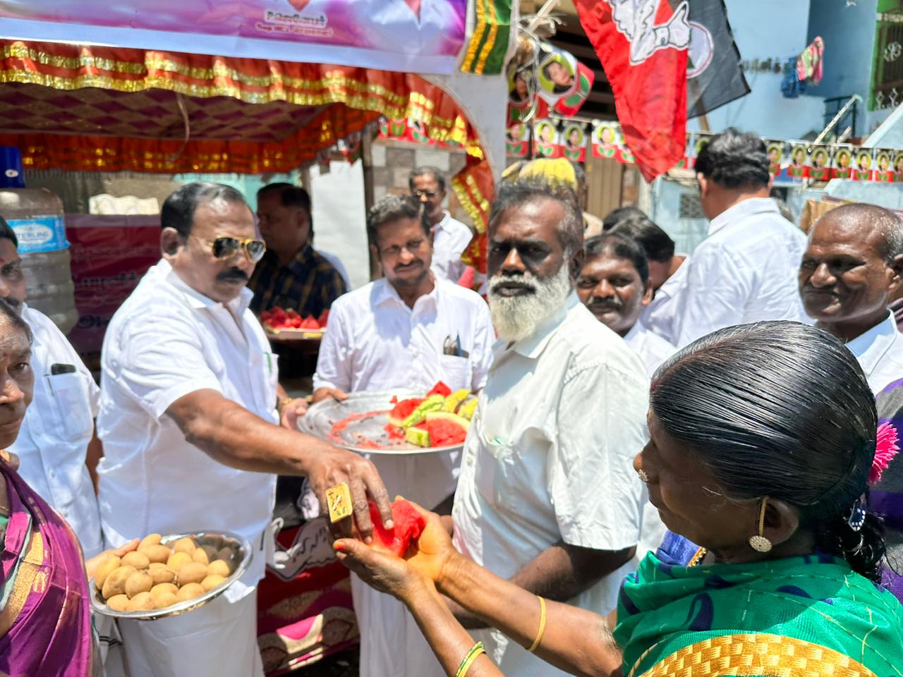 தூத்துக்குடி அதிமுக பொதுச்செயலாளரும் முன்னாள் முதலமைச்சரும் சட்டமன்ற எதிர்கட்சி தலைவருமான எடப்பாடி பழனிச்சாமி உத்தரவிற்கிணங்க தூத்துக்குடி மாநகரம் 8வது வார்டு திரேஸ்புரம் பகுதியில் அமைக்கப்பட்டிருந்த தண்ணீர்பந்தலை திறந்து வைத்து தர்பூசணி, இளநீர், பதநீர், லட்டு, உள்ளிட்ட பல்வேறு குளிர்பானங்கள் பொதுமக்களுக்கு அதிமுக அமைப்பு செயலாளரும் முன்னாள் முதலமைச்சருமான சி.த.செல்லப்பாண்டியன் வழங்கினார்.