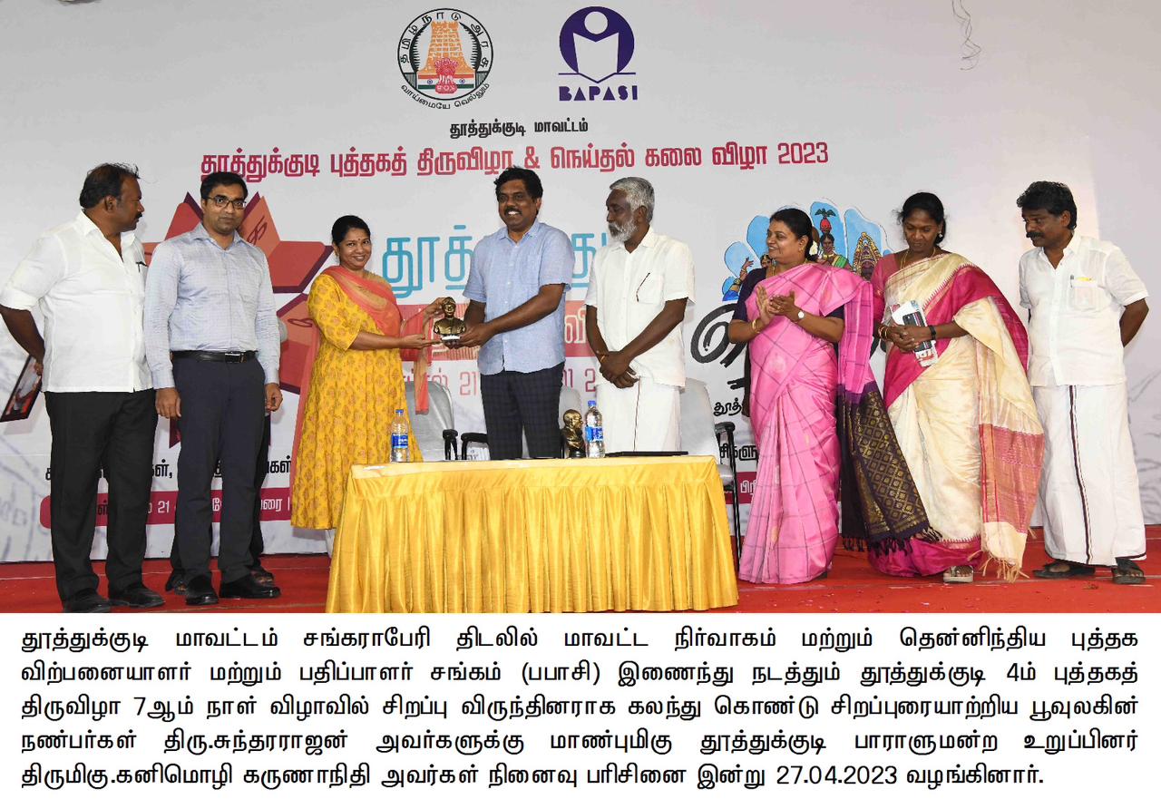 பூவுலகின் நண்பர் சுந்தர்ராஜன் பேசுகையில் எனக்கு தூத்துக்குடி மாவட்டத்தின் மீது கொஞ்சம் போராமை உண்டு. அதற்கு என்ன காரணம் என்றால் கனிமொழி எம்.பி இரண்டாவது முறையாக இந்த புத்தக திருவிழாவை நடத்துகிறார். மற்றொண்டு பாரளுமன்றத்தில் அவர் கேட்கும் பல கேள்விகளுக்கு அமைச்சரை பதில் சொல்ல வைக்கிறார். தூத்துக்குடி கடற்கரை பகுதிகளில் இருந்த 21 தீவுகளில் தற்போது 19 தான் உள்ளன. 2034ம் ஆண்டு மேலும் 6 தீவுகள் குறைவதற்கான வாய்ப்புகள் உள்ளது. என்று ஆராய்;ச்சியாளர்கள் கூறுகின்றனர். இந்த நிலை தொடர்வது நல்லதல்ல. அதில் கவனம் செலுத்த வேண்டும். திராவிட மாடல் சமூகநீதி என்பதை யெல்லாம் கடைபிடிக்கும் இந்த காலக்கட்டத்தில் தமிழர்கள் இயற்கையை நேசிக்க வேண்டும். பேரன் பேத்திகள் வாழும் காலத்தில் நம் கடலையும் இயற்கை நலன் சார்ந்த வளங்களையும் பாதுகாக்க வேண்டும். என்று பேசினார்.