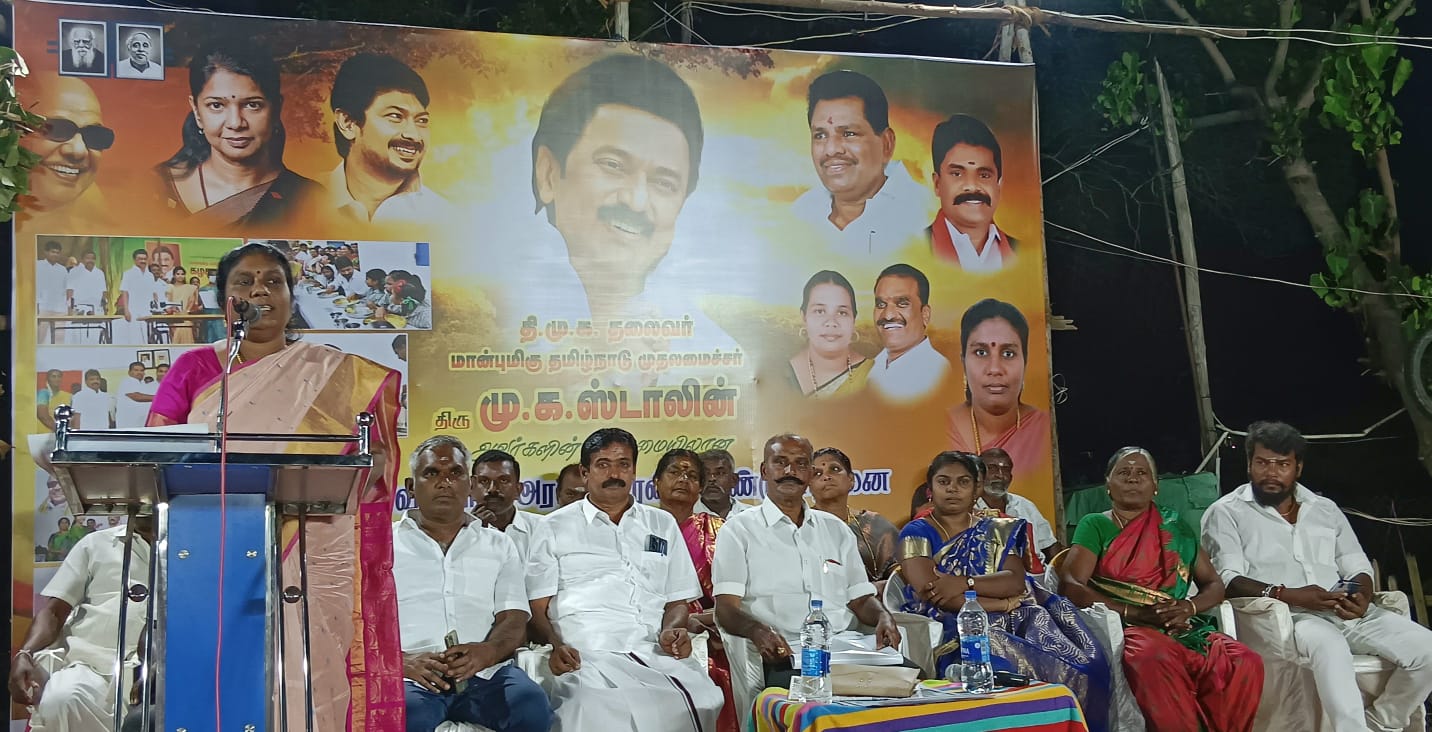 திமுக மாநில மகளிர் அணி செயலாளரும் முன்னாள் எம்.பியுமான ஹெலன் டேவிட்சன் பேசுகையில் ஒட்டப்பிடாரம் சட்டமன்ற தொகுதி தேர்தலின் போது இந்த பகுதியில் உங்களோடு பணியாற்றுகிறேன். தனிப்பெரும்பான்மையுடன் திராவிட மாடல் ஆட்சி எல்லோருக்கும் எல்லாம் கிடைக்க வேண்டும். என்று திமுக ஆட்சி செய்து வருகிறது. 10 ஆண்டு அதிமுக ஆட்சிக்காலத்தில் பிஜேபிக்கு அடிமையாக இருந்து தமிழ்நாட்டை கடனில் தத்தளிக்க விட்டு செய்தது. அந்த நிதி பற்றாக்குறையையும் ஓரளவு சரிசெய்து முதலமைச்சர் கொடுத்த வாக்குறுதியை 90 சதவீதம் நிறைவேற்றியுள்ளோம். இதை பொறுத்துக்கொள்ள முடியாத எதிர்கட்சியினர் பொய்யான குற்றச்சாட்டுகளை சமூக வலைதளம் மூலம் பரப்பி வருகின்றனர். இரண்டு ஆண்டு சாதனையை தமிழகம் முழுவதும் 1222 இடங்களில் நடைபெறுகின்றன. முதலமைச்சராக பொறுப்பேற்றதும் கொரோனா காலக்கட்டத்தில் 4 ஆயிரம் உதவித்தொகை பால்விலை குறைப்பு இலவச பேருந்து பயணம் உங்கள் தொகுதியில் ஸ்டாலின் என பல அறிவிப்பு செய்தார். ஏன் இந்த ஆட்சிக்கு நாம் வாக்களிக்காமல் விட்டோம் என்று மக்கள் குறைப்பட்டு கொள்ளும் அளவிற்கு சாதனைகள் செய்துள்ளோம். தலைமை செயலகத்தில் மட்டும் இருந்;து கொண்டு பணியாற்றிய முதல்வர்கள் உண்டு ஆனால் நம் முதல்வர் அந்த பணி மட்டுமின்றி அறிவித்த திட்டங்கள் அனைவருக்கும் சென்றடைகின்றதா என்று மாவட்டம் தோறும் ஆய்வுகளையும் மேற்கொள்கிறார். கல்வி உதவித்தொகை, வீடு தேடி மருத்துவம், சுயஉதவிக்குழுக்களுக்கு கடனுதவி 89ல் கலைஞர் தொடங்கிய மகளிர் குழுக்களை ஊக்குவிக்கும் வகையில் 2006 முதல் 2011ல் உள்ளாட்சிதுறை அமைச்சராக இருந்த ஸ்டாலின் மாவட்டம் தோறும் சூழல் நிதி வழங்கினார். 10 ஆண்டுகளாக அதிமுக எந்த உதவியும் செய்யவில்லை. மகளிர் சுய உதவிக்குழு கடன்ரத்து, மறுபடியும் 30 ஆயிரம் கோடி கடன்வழங்க ஓதுக்கீடு ஆப்பிள் ஐ தொழில் நிறுவனம் வாரத்தில் நான்குநாட்கள் விடுமுறை அளித்து மத்த நாட்களில் 12 மணி நேரம் வேலை கொடுக்க வேண்டும் என்ற அடிப்படையில் கொண்டு வரப்பட்ட 12 மணி நேர வேலைசட்டத்தையும் திமுக தொழிற்சங்கமே எதிர்ப்பு தெரிவித்தது இதுதான் ஜனநாயகம் பின்னர் அது வாபஸ் பெறப்பட்டது. கலைஞர் ஆட்சியில் என்னற்ற சாதனைகளை பெண்களுக்கு வழங்கி 33 சதவீதம் உள்ளாட்சியில் வழங்கினார். முதல்வர் ஆட்சியில் 40சதவீதம் அரசுப்பணி தற்போது வெளிவந்துள்ள 12 தேர்வில் அதிக தேர்ச்சி பெற்றுள்ளனர். அதுவும் அரசு பள்ளியில் பயின்றவர்கள். இவர்களது மேல்படிப்பு மருத்துவம் பொறியியல் கல்வி கட்டணத்தை அரசே செலுத்துகிறது. இங்கு எம்.பியாக உள்ள கனிமொழி கலைஞரின் மகளாகவும் முதல்வரின் தங்கையாகவும் இருந்து உங்களுக்கு நல்ல பணியை செய்து வருக