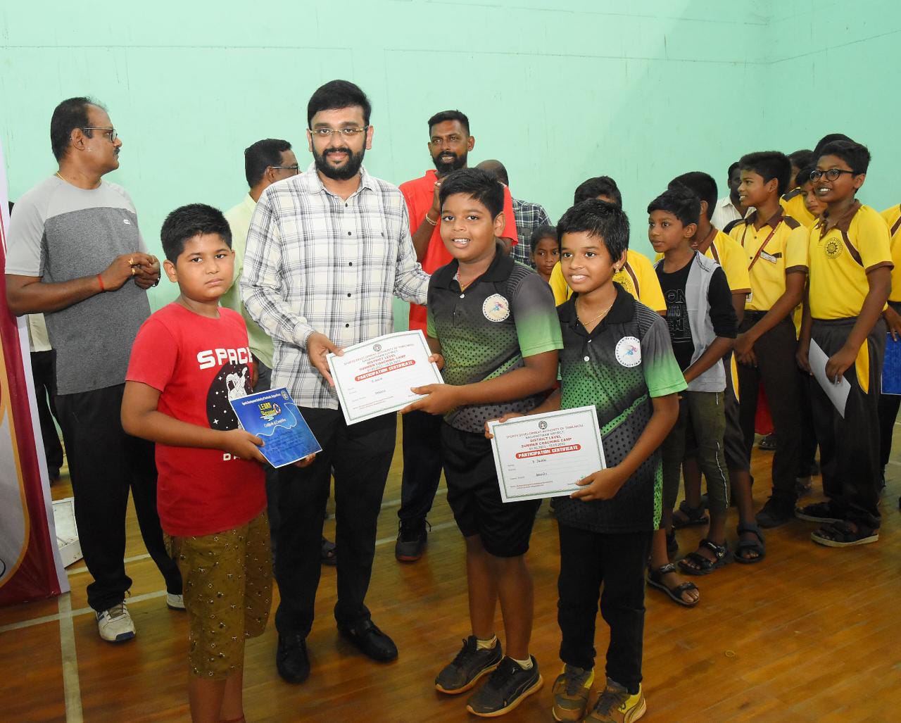 நாகப்பட்டினம், முத்தமிழறிஞர் டாக்டர் கலைஞர் கருணாநிதி மாவட்ட விளையாட்டரங்கில் உள்ள உள் விளையாட்டு அரங்கில் நடைபெற்ற மாவட்ட அளவிலான கோடைக்கால பயிற்சி முகாம் நிறைவு விழாவில் பயிற்சி முகாமில் கலந்து கொண்ட மாணவ, மாணவியர்களுக்கு சான்றிதழ்களை மாவட்ட ஆட்சித்தலைவர் டாக்டர் அ. அருண் தம்புராஜ் வழங்கினார்.