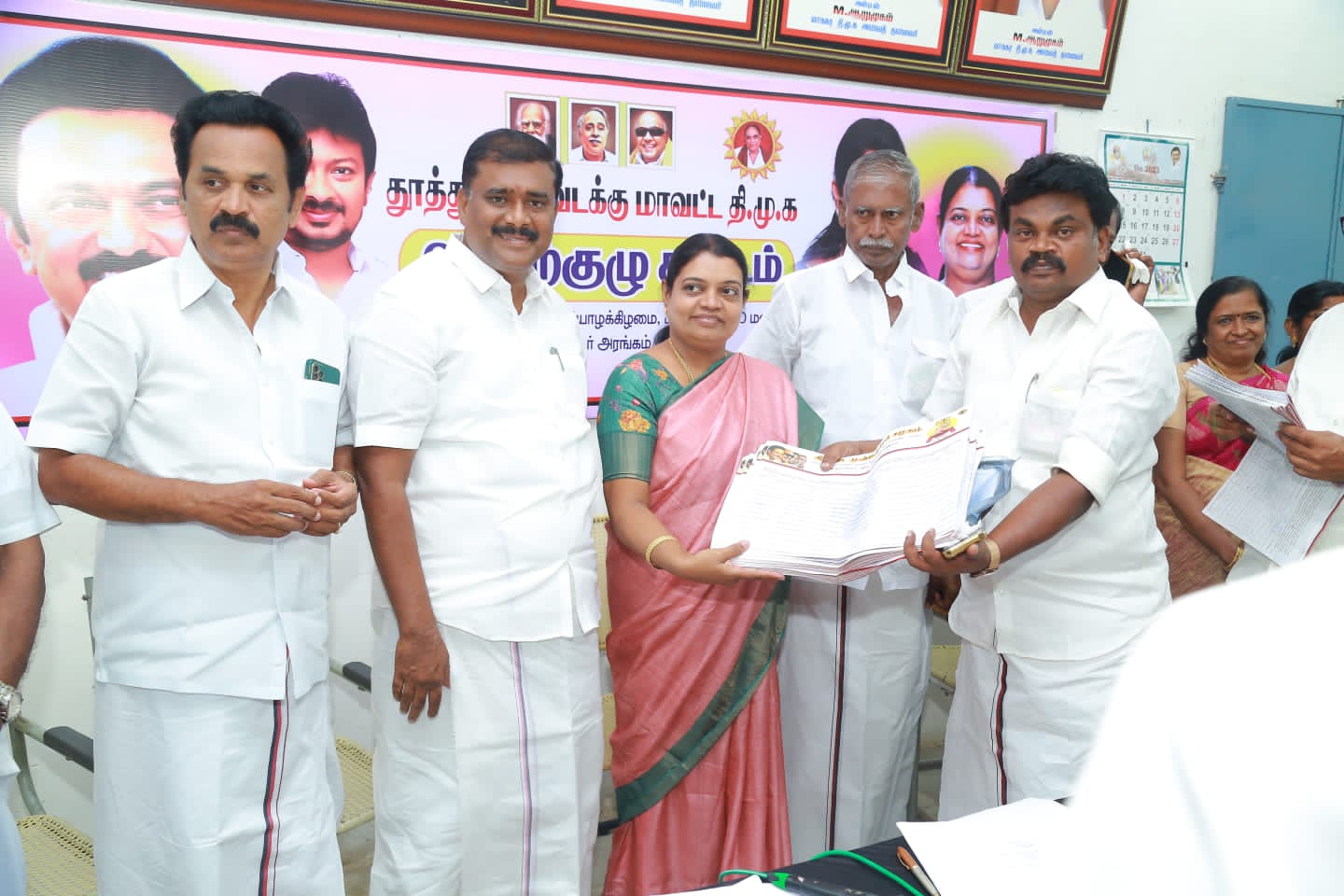 பின்னர் புதிய உறுப்பினர் சேர்க்கை படிவத்தை அமைச்சர் பெற்றுக்கொண்டார். எல்லோருக்கும் எல்லாம் என்ற குறிக்கோளுடன் தமிழகத்தில் திராவிட மாடல் ஆட்சி நடத்தி வரும் முதல்வர் ஸ்டாலின் ஆட்சியில் பல நல்ல திட்டங்கள் வந்துள்ளது. குறிப்பாக மகளிருக்கு பேருந்தில் இலவச பயணம், மாணவ மாணவியர் கல்வியில் உயர புதுமைப்பெண்; திட்டம் நான் முதல்வன் திட்டத்தில் காலை உணவு சிற்றுண்டி செப்டம்பர் 15ல் மகளிருக்கு 1000 உரிமைத்தொகை வேலைவாய்ப்பு பெற பல்வேறு தொழிற்சாலைகள் குறிப்பாக தூத்துக்குடி மாவட்டத்தில் 1000 கோடியில் பர்னிச்சர் பூங்கா 30 கோடியில் மினி டைட்டல் பார்க், 80 சதவீத தேர்தல் வாக்குறுதி நிறைவேற்றம் ஜல்லிக்கட்டு தடையை உச்ச நீதிமன்றத்தில் தமிழக அரசின் சார்பில் வாதாடி பெற்றுக் கொடுத்தது. தமிழகத்தின் வளர்ச்சிக்காக 24 மணிநேரமும் உழைத்து வரும் முதல்வரை இக்கூட்டம் பாராட்டுகிறது. திமுகவை தோற்றுவித்த அண்ணாவின் மறைவிற்கு பின் திமுகவை கட்டிக்காத்து 5 முறை முதலமைச்சராக இருந்து தமிழகத்தை முன்னேற்ற பாதைக்கு கொண்டு சென்றவர் கலைஞர். தன்னுடைய கடைசி காலம் வரை தமிழ் தமிழர் நலன் சமத்துவம் சமூகநீதி என்று பாடுபட்டவர் அவர் நம்மைவிட்டு சென்றாலும் அவரது கொள்கை கோட்பாடுகளில் இன்றைய முதல்வர் இயக்கத்தை வழிநடத்தி வருகிறார். கலைஞர் போட்டியிட்ட அனைத்து தேர்தலிலும் வெற்றி பெற்று இந்திய ஜனநாயக காவலராக திகழ்ந்தவர். பன்முக ஆற்றலை அடுத்து வரும் தலைமுறையினர் தெரிந்து கொள்ளும் வீதமாக பொதுக்கூட்டங்கள் கவியரங்கங்கள் கருத்தரங்கங்கள் நடத்துவது குறித்து 5 தீர்மானங்கள் நிறைவேற்றப்பட்டன.