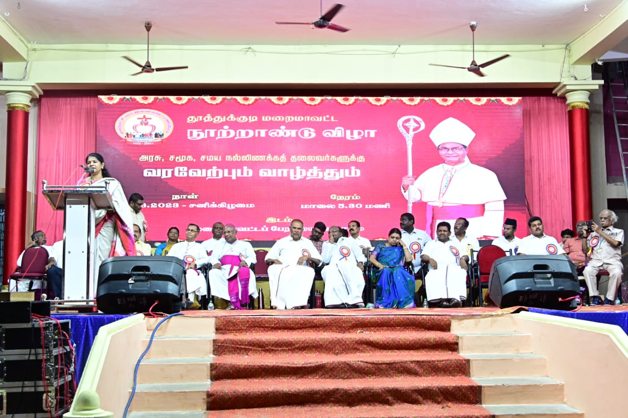 விழாவில் கனிமொழி எம்.பி பேசுகையில் இன்று சமூகத்தில் இருக்க கூடிய மதநல்லிணக்கத்தை சீர்குலைக்க வேண்டும் என்று சிலர் விரும்புகிறார்கள். எல்லா உயிர்களையும் ஒன்றாக மதிக்க கூடிய சமூகத்தில் கருத்து வேறுபாடு இல்லை. தமிழக சமூக மக்களின் ஆணிவேர் அடித்தளங்களை உடைத்து நொருக்கப்பட வேண்டும். என்று காழ்ப்புணர்ச்சியோடு பணியாற்றுகின்றனர். மதநல்லிணக்கத்திற்கு எடுத்துக்காட்டாக இந்த விழா நடைபெறுகிறது. நான்படித்த கல்லூரியில் தான் ஜெயலலிதாவும் படித்தார். எங்கேயும் மதமாற வேண்டும் என்று யாரும் கட்டாயபடுத்தியது கிடையாது. ஆனால் ஜெயலலிதா ஆட்சியில் தான் மதமாற்ற தடை சட்டம் கொண்டு வந்தார். நான் கல்லூரி படிக்கும் போது பெரியாரின் கொள்கையை பின்பற்றி அவ்வழியில் சென்றேன். பெண்கள் ஒருகாலத்தில் பாதிக்கப்பட்ட சமயங்களில் அவர்களுக்கான உரிமை உடமை போன்ற பல்வேறு முடிவுகளுக்கு கிறிஸ்தவ சபை துணை நின்றது. பெரும் மகிழ்ச்சி என்னவென்றால் கலைஞரின் நூற்றாண்டு விழா கொண்டாடும் வேலையில் இங்கு மறைமாவட்ட நூற்றாண்டு விழா கொண்டாடப்படுகிறது. கலைஞர் சமூகநீதி ஓடுக்கப்பட்ட மக்களுக்காக விடிவெள்ளியாக இருந்தார். அதே வழியில் நீங்களும் பயணிக்க வேண்டும். எந்த நெருக்கடிகள் மற்றும் உழைப்பவர்களுக்குரிய பாகுபாடுகள் பிரிவினை உரிமைபறிப்பு சமூகநீதி தாழ்ந்தவன் என்று பலரையும் பார்க்கப்பட்டு கருத்து சொல்லக்கூடாது என்று நினைப்பவர்களுக்கு இந்த தமிழகத்தில் இடமில்லை போராட்டங்கள் அடையாளங்கள் சுயமரியாதை இந்து கிறிஸ்தவம் முஸ்ஸீம் அனைவரும் ஜாதி மதம் கடந்து மனிதநேயத்தோடு பழகி வரும் வேளையில் அதை பிரித்தாலும் சூழ்ச்சிக்கு இடமளிக்க கூடாது. கடந்து வந்த பாதையை மறக்காமல் நமது உரிமையை பாதுகாத்து அடுத்து வரும் தலைமுறைக்கு தெரியும் வகையில் செயல்பாடுகள் இருக்க வேண்டும். முதலமைச்சர் கலைஞர் நூற்றாண்டு விழாவின் போது அடுத்து இந்தியாவை வழிநடத்த யார் வரவேண்டும் யார் வரக்கூடாது என்று அவர் பேசிய உறுதியான முடிவை பின்பற்ற வேண்டும். ஒருவரை ஒருவர் மதிக்க வேண்டும் இவ்வாறு பேசினார்.