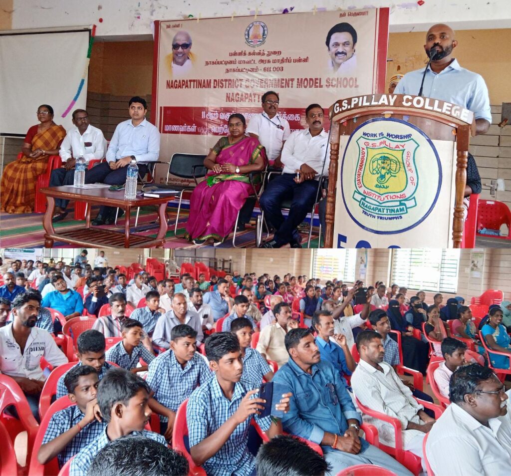 நாகப்பட்டினம் மாவட்டத்தில் உள்ள இ.ஜி.எஸ். பிள்ளை கல்லூரியில் மாவட்ட அரசு மாதிரி பள்ளியில் 11ஆம் வகுப்பு மாணவர் சேர்க்கை, மாணவர்கள் மற்றும் பெற்றோர்களுக்கான ஆலோசனைக்கூட்டம் மற்றும் மாவட்ட ஒருங்கிணைந்த பள்ளிக்கல்வித்துறை மற்றும் தமிழ்நாடு கல்வி ஃபெல்லேஷிப் சார்பில் எண்ணும் எழுத்தும் விழிப்புணர்வு காணொளியினை மாவட்ட ஆட்சித்தலைவர் ஜானி டாம் வர்கீஸ் தொடங்கி வைத்தார்.