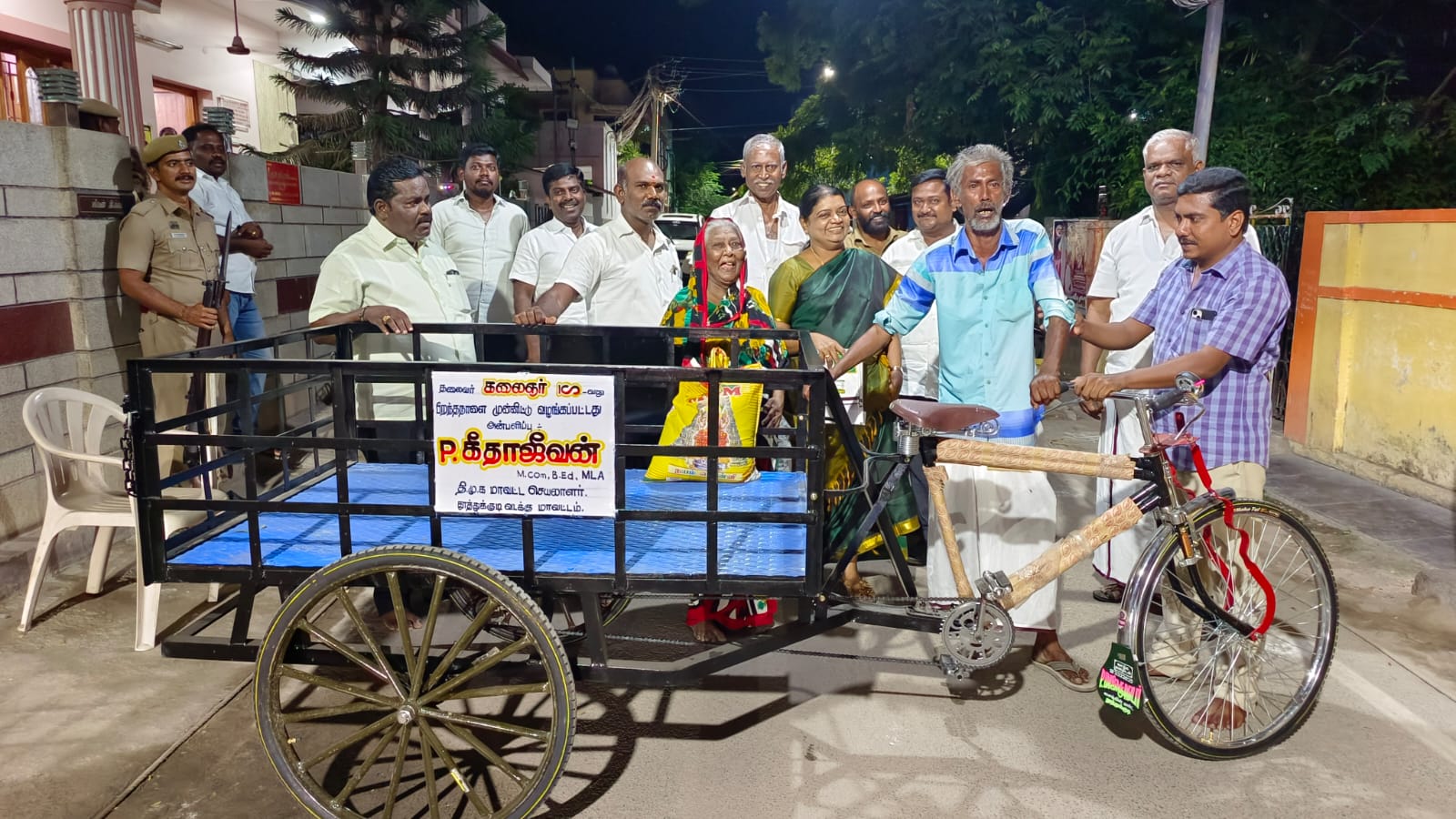 இதனையடுத்து கலைஞர் நூற்றாண்டு விழாவையொட்டி போல்பேட்டையில் உள்ள தனது அலுவலகத்தில் வைத்து அசன் அலிக்கு 3 சக்கர சைக்கிள் வழங்கி நல்ல முறையில் தொழிலுக்கு பயன்படுத்திக்கொள்ள வேண்டும். என்று கேட்டுக்கொண்டார்.