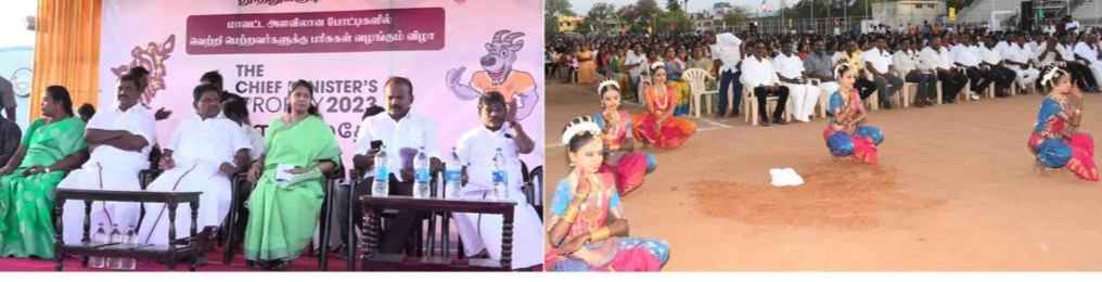தூத்துக்குடி தருவை மைதானத்தில் நடைபெற்ற மாவட்ட அளவிலான முதலமைச்சர் கோப்பைக்கான விளையாட்டு போட்டிகளில் வெற்றி பெற்றவர்களுக்கு நடைபெற்ற பரிசளிப்பு விழாவிற்கு கனிமொழி எம்.பி தலைமை வகித்தார். மீன்வளம்-மீனவர் நலன் மற்றும் கால்நடை பராமரிப்புத்துறை அமைச்சர் அனிதா ராதாகிருஷ்ணன், மேயர் ஜெகன் பெரியசாமி, எம்.எல்.ஏக்கள் மார்க்கண்டேயன், சண்முகையா, ஆகியோர் முன்னிலை வகித்தார். மாவட்ட விளையாட்டு மற்றும் இளைஞர் நலன் அலுவலர் அந்தோணி அதிஷ்டராஜ் வரவேற்புரையாற்றினார்.