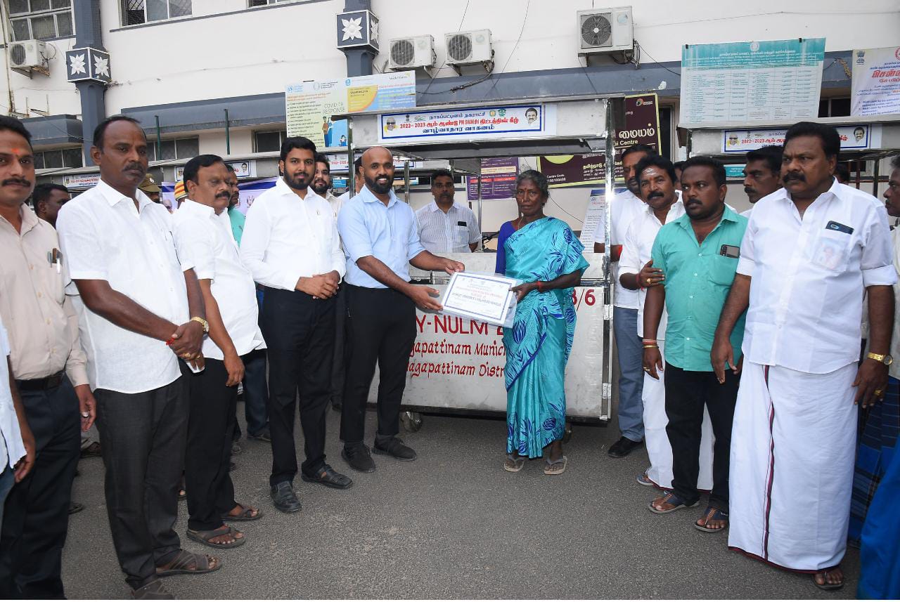 நாகப்பட்டினம் மாவட்ட ஆட்சியர் அலுவலக வளாகத்தில் நகராட்சி நிர்வாகம் மற்றும் குடிநீர் வழங்கல் துறை சார்பில் சாலையோர வியாபாரிகளுக்கு இலவச விற்பனை வண்டி வழங்கும் விழாவினை மாவட்ட ஆட்சித்தலைவர் ஜானி டாம் வர்கீஸ், இ.ஆ.ப., அவர்கள் இன்று தொடங்கி வைத்து, சாலையோர வியாபாரிகளுக்கு இலவச விற்பனை வண்டியினை வழங்கினார்.