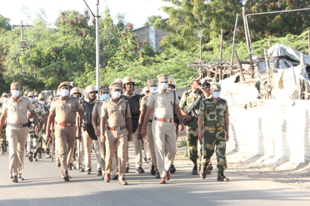 வருகின்ற தமிழக சட்டமன்ற தேர்தல் பாதுகாப்பை முன்னிட்டு தூத்துக்குடி நகர உட்கோட்டம் தாளமுத்துநகர் மற்றும் தூத்துக்குடி வடபாகம் காவல் நிலைய எல்லைக்குட்பட்ட பகுதிகளில் மாவட்ட போலீஸ் சூப்பிரண்டு எஸ்.ஜெயக்குமார் தலைமையில் காவல்துறை மற்றும் துணை ராணுவபடையினரின் கொடி அணிவகுப்பு நடைபெற்றது.