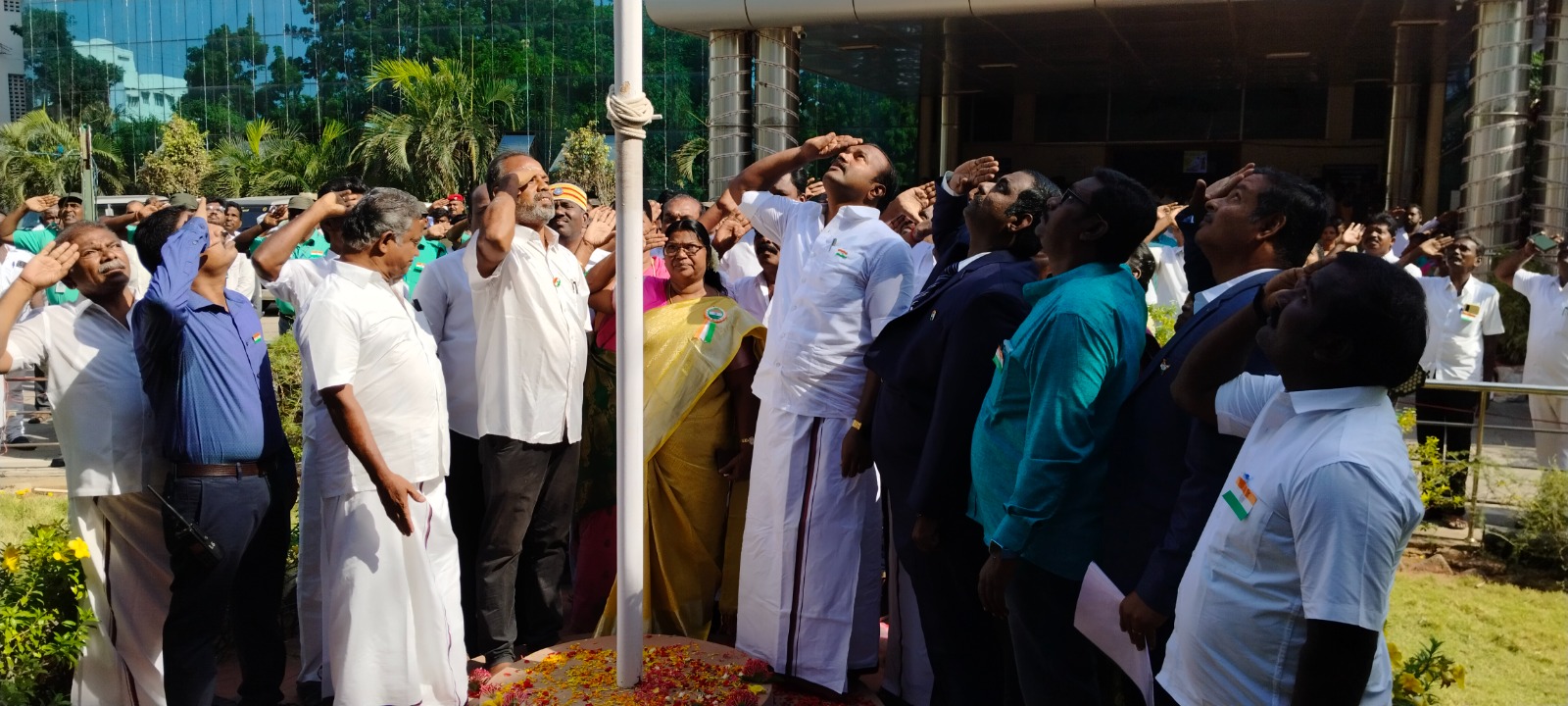 77வது சுதந்திர தினவிழாவையொட்டி தூத்துக்குடி மாநகராட்சி அலுவலகத்தில் நடைபெற்ற சுதந்திர தின விழாவிற்கு மாநகராட்சி ஆணையர் தினேஷ்குமார் தலைமை வகித்தார். இணை ஆணையர் ராஜாராம், வரவேற்புரையாற்றினார்.