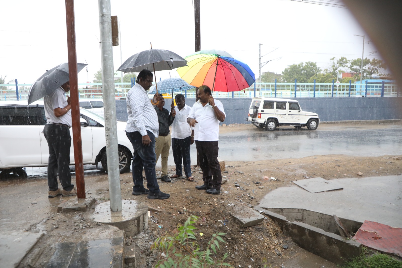 இதற்கிடையில் தூத்துக்குடி பகுதியில் திடீரென பெய்த கனமழையால் மழைநீர் எங்கும் தேங்காத வகையில் நடவடிக்கை எடுக்கும் விதமாக மேயர் ஜெகன்பெரியசாமி, ஆணையர் தினேஷ் குமாருடன் கொட்டும் மழையில் சி.வ.அரசு பள்ளி அருகில், மாநகராட்சி எதிரில், போல்டன்புரம் பள்ளி அருகில், கடற்கரை சாலை கரிக்களம் பகுதி மற்றும் ஓடை குரூஸ்புரம், கந்தசாமிபுரம், செல்வநாயகபுரம், டி.எம்.சி.காலனி, புதிய பேருந்து நிலையம் அருகிலுள்ள பகுதி உள்ளிட்ட இடங்களில் அவசர நடவடிக்கை மேற்கொண்டு, மழை நீர் வெளியேறுவதை பார்வையிட்டார்.