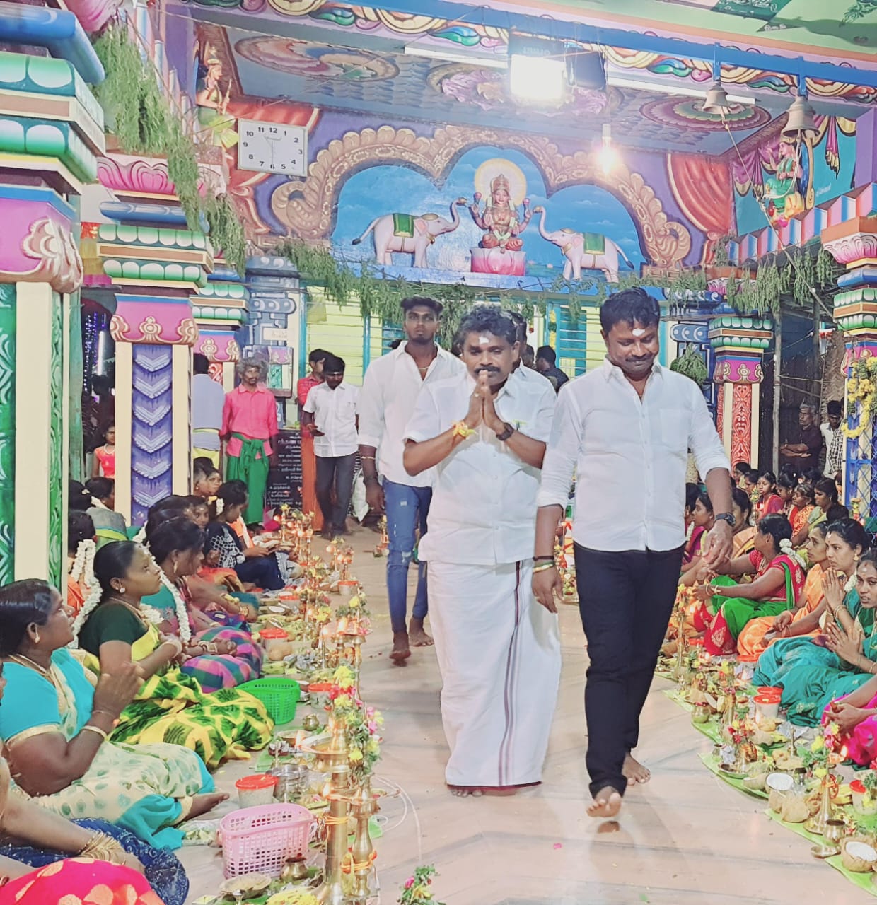 தூத்துக்குடி ஓட்டப்பிடாரம் சட்டமன்ற தொகுதிக்குட்பட்ட மாப்பிள்ளையூரணி ஊராட்சி மாதாநகரில் உள்ள சந்தனமாரியம்மன் கோவில் கொடைவிழாவையொட்டி நடைபெற்ற திருவிளக்கு பூஜையில் கலந்து கொண்ட பெண்கள் அனைவருக்கும் தெற்கு மாவட்ட திமுக சுற்றுச்சூழல் அணி சார்பாக சண்முகையா எம்.எல்.ஏ சேலை வழங்கினார்.