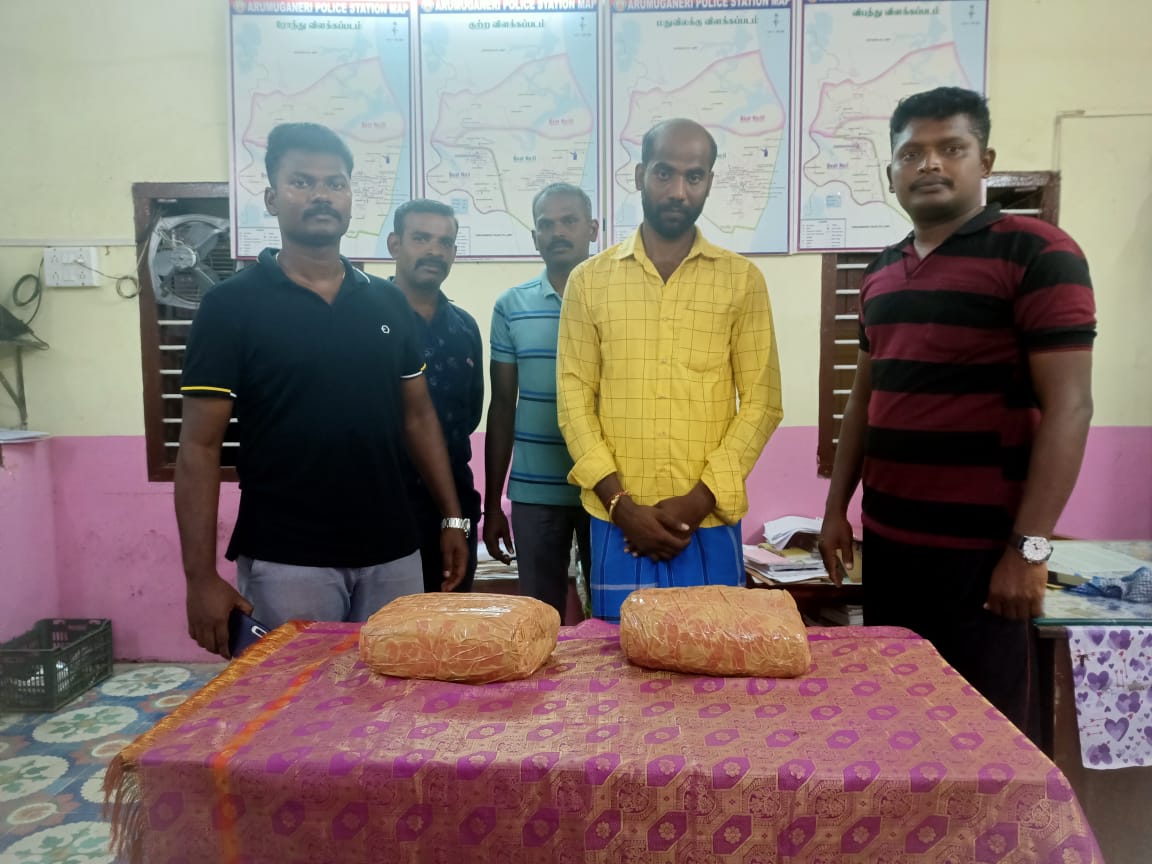 இந்நிலையில் திருச்செந்தூர் காவல் நிலைய உதவி ஆய்வாளர் திரு. சுந்தரம் தலைமையில் தலைமைக் காவலர்கள் திரு. ராஜ்குமார், திரு. இசக்கியப்பன், திரு. சொர்ணராஜ் ஆகியோர் அடங்கிய தனிப்படையினர் நேற்று (10.03.2021) ரோந்துப்பணியில் ஈடுபட்டபோது ஆறுமுகநேரி சோதனைச் சாவடி அருகே காயல்பட்டினம் மன்னர் ராஜா கோவில் தெருவைச் சேர்ந்த கணேசன் மகன் ஆறுமுகம் (32) என்பவர் சட்டவிரோதமாக கஞ்சா விற்பனை செய்வதற்காக 4 கிலோ கஞ்சா வைத்திருந்தது கண்டுபிடிக்கப்பட்டு, அவரை கைது செய்து, அவரிடமிருந்த கஞ்சாவும் பறிமுதல் செய்யப்பட்டது. இது சம்மந்தமாக ஆறுமுகநேரில் காவல் நிலைய காவல் ஆய்வாளர் திரு. செந்தில்குமார் வழக்குப்பதிவு செய்து விசாரணை மேற்கொண்டு வருகிறார்.