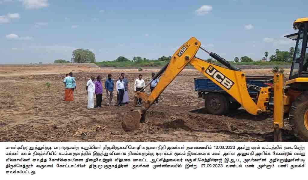 அதனைத் தொடர்ந்து, கடம்பாகுளத்தில் இருந்து விவசாய நிலங்களுக்கு மட்டுமே பயன்படுத்துவதற்கு டிராக்டர் மூலம் விலையில்லாமல் மண் எடுப்பதற்கு அனுமதி வழங்கப்பட்டு அப்பணிகளை திருச்செந்தூர் வருவாய் கோட்டாட்சியர் குருச்சந்திரன் நேற்று (27/09/2023) துவக்கி வைத்தார்.