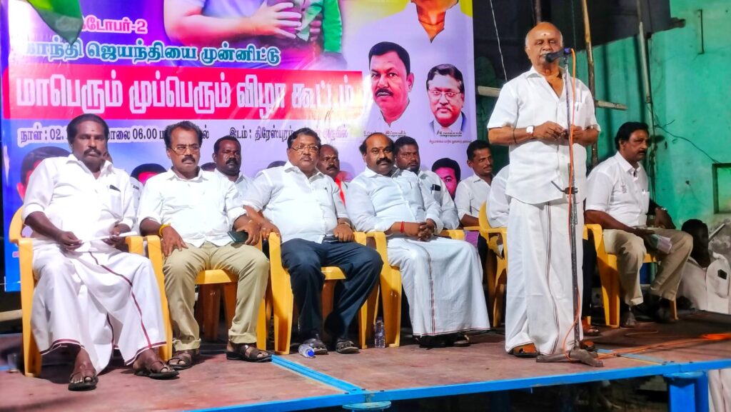 தூத்துக்குடி மாநகர் மாவட்ட காங்கிரஸ் சிறுபான்மை பிரிவு சார்பில் காந்தி ஜெயந்தி விழா, சிவாஜி கணேசன் பிறந்த நாள் விழா மற்றும் காமராஜர் நினைவு நாள் ஆகிய முப்பெரும் விழா தூத்துக்குடி திரேஸ்புரம் ஜங்ஷனில் நடைபெற்ற கூட்டத்திற்கு காங்கிரஸ் சிறுபான்மை பிரிவு மாவட்ட தலைவர் மைதீன் தலைமை வகித்தார்.