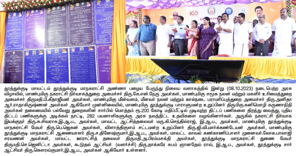 தூத்துக்குடி மாநகராட்சி அண்ணா பழைய பேருந்து நிலைய வளாகத்தில் நடைபெற்ற அரசு விழாவிற்கு நகராட்சி நிர்வாகத்துறை அமைச்சர் கே.என்.நேரு, நிதி மற்றும் மனிதவள மேலாண்மைத்துறை அமைச்சர் தங்கம் தென்னரசு, சமூக நலன் மற்றும் மகளிர் உரிமைத்துறை அமைச்சர் கீதாஜீவன், மீன்வளம், மீனவர் நலன் மற்றும் கால்நடை பராமரிப்புத்துறை அமைச்சர் அனிதா ஆர்.ராதாகிருஷ்ணன் அவர்கள் ஆகியோர் முன்னிலையில் கனிமொழி எம்.பி தலைமையில் பல்வேறு துறைகளின் சார்பில் மொத்தம் ரூ.200 கோடி மதிப்பீட்டில் முடிவுற்ற திட்டப் பணிகளை திறந்து வைத்து, புதிய திட்டப் பணிகளுக்கு அடிக்கல் நாட்டி, பயனாளிகளுக்கு அரசு நலத்திட்ட உதவிகளை வழங்கினார்கள்.