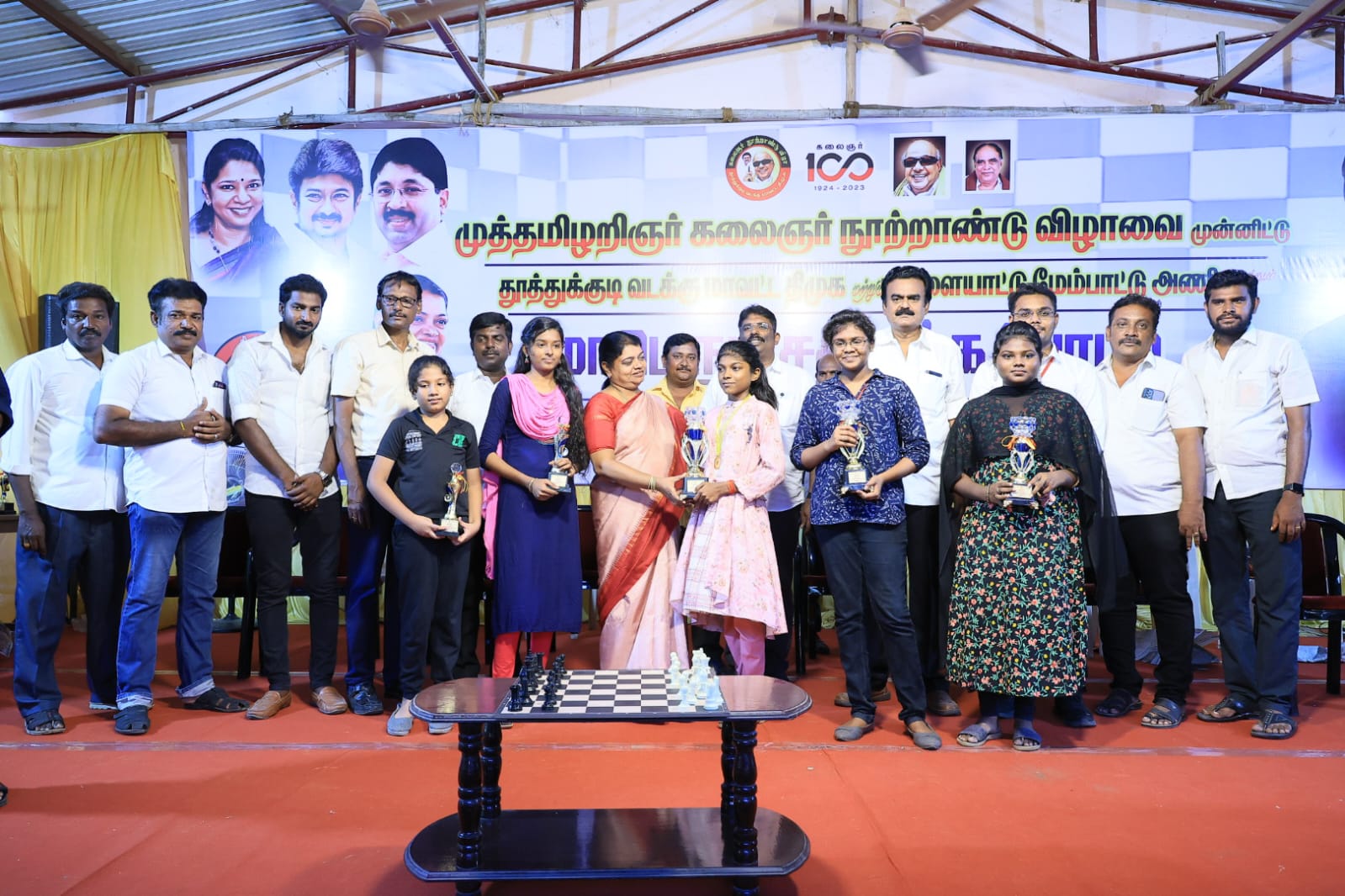 கலைஞர் நூற்றாண்டு விழாவை முன்னிட்டு வடக்கு மாவட்ட திமுக விளையாட்டு மேம்பாட்டு அணியின் சார்பில் கீதா மெட்ரிக் மேல்நிலைப் பள்ளியில் நடைபெற்ற சதுரங்க போட்டியில் வெற்றி பெற்ற குழந்தைகளுக்கு வடக்கு மாவட்ட திமுக செயலாளரும் சமூகநலன் மற்றும் மகளிர் உரிமைத்துறை அமைச்சருமான கீதாஜீவன் சான்றிதழ்கள் மற்றும் பரிசுகள் வழங்கி பேசுகையில் கலைஞர் நூற்றாண்டு விழாவை ஒருவருடம் முழுவதும் கொண்டாட வேண்டும் அவரது சாதனைகள் மற்றும் எல்லாத்துறையிலும் முத்திரை பதித்ததை நாட்டுமக்களுக்கு நினைவுப்படுத்த வேண்டும். என்று முதலமைச்சர் கேட்டுக்கொண்டதிற்கிணங்க வடக்கு மாவட்ட திமுகவிற்குட்பட்ட எல்லா பகுதிகளிலும் நலத்திட்ட உதவிகளுடன் பல்வேறு நிகழ்வுகள் நடைபெறுகின்றன. ஏற்கனவே விளையாட்டு மேம்பாட்டு அணி சார்பில் கிரிக்கெட் போட்டி நடைபெற்றது. இதனையடுத்து சிறுவர் சிறுமியர்களுக்கான சதுரங்க போட்டி நடத்தப்பட்டுள்ளது. இந்த போட்டிக்கும் திறமைகள் அதிகம் தேவைப்படுகின்ற விளையாட்டாகும். எந்த துறையை தேர்ந்தெடுத்து பணியாற்றினாலும் முழுமையாக தன்னை ஈடுபடுத்திக்கொண்டு கிடைத்த வாய்ப்பை பயன்படுத்தி கொள்ள வேண்டும். கல்வியும் விளையாட்டும் நமக்கு அவசியமானது என்பதை உணர்ந்து எதிர்கால தலைமுறையினராகிய நீங்கள் நல்ல பழக்க வழக்கங்களுடன் எல்லாத்துறைகளிலும் சாதனை படைக்க வேண்டும். என்று பேசினார்.