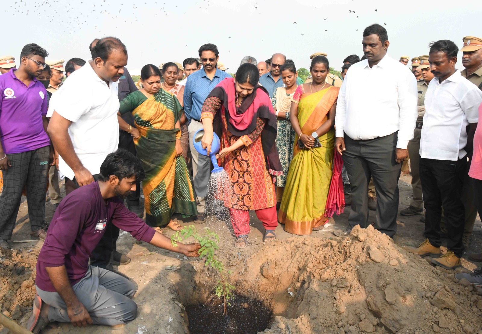 நகரின் நீர் மேலாண்மையை மேம்படுத்தும் விதமாக மாநகராட்சிக்குட்பட்ட பகுதிகளில் பாதாள சாக்கடை அமைப்புகள் அமைக்கப்பட்டு சேகரிக்கப்படும் கழிவுநீர் தருவைகுளம் கலவை உரங்கிடங்கில் அமையப்பெற்ற சுமார் 28 எம்எல்டி கொள்ளவு கொண்ட கழிவுநீர் சுத்திகரிப்பு ஆலை மூலம் சுத்திகரிக்கப்பட்டு வருகிறது. இந்த நீரினை திறம்பட பயன்படுத்தும் விதமாகவும் இயற்கை சூழலை மேம்படுத்தும் விதமாகவும் அதிகப்படியான மரங்களை நட்டி பாராமரிக்க திட்டமிட்டத்தின் அடிப்படையில் இதுவரை சுமார் 50 ஆயிரத்திற்கு மேம்பட்ட மரங்கள் நடப்பட்டுள்ள நிலையில் தற்போது கூடுதலாக 60 ஏக்கர் பரப்பளவில் தூத்துக்குடி மாநகராட்சி மாவட்ட வனத்துறை தூத்துக்குடி விமான நிலைய ஆணையரகம் இணைந்து விமான நிலைய ஆணையகரத்தில் சமூக கூட்டாண்மை நிதியின் கீழ் 93லட்சம் மதிப்பீட்டில் 60 ஏக்கர் நிலப்பரப்பில் 60 ஆயிரம் மரக்கன்றுகளை மியாவாக்கி என்ற அடர்காடுகள் முறையில் நடும் நிகழ்வும் மாநகராட்சி சார்பாக பலன் தரும் மரங்களை நடுவதற்கு உத்தேசித்து ஓரு ஏக்கர் பரப்பளவில் இனிப்பு புளி, நாட்டு புளி, சிவப்பு புளி, குடம்புளி கொடுக்காபுளி, போன்ற பல்வேறு வகையான புளியமரங்களும் சுமார் ஓரு ஏக்கர் பரப்பளவில் ஆண்டுதோறும் பறவைகளுக்கு பயன்படும் வகையில் ஆலமரங்களும் கால்நடைகளுக்கு ஏற்படும் தீவன பற்றாக்குறையை போக்கி தரமான தீவனங்கள் ஆண்டுதோறும் கிடைக்க வழிவகை செய்யும் விதத்தில் பொதுமக்களுக்கு நல்ல சத்தான பால் கிடைக்கும் வகையிலும் மாட்டுத்தீவனம் உற்பத்தி செய்து நியாய விலையில் விற்பனை செய்யவும் உத்தேசித்து சோதனை முயற்சியாக ஓரு ஏக்கர் நிலப்பரப்பில் கோவை வேளாண் பல்கலைக்கழகம் ஆராய்ச்சி மையத்தால் பரிந்துரைக்கப்பட்டுள்ள அதிகப்படியான புரசத்தும் குறைந்த அளவு கழிவுகளுடைய கோளப் எஸ் 29 என்ற ரக மாட்டுத்தீவனம் விதைத்தல் நிகழ்ச்சிக்கு கனிமொழி எம்.பி தலைமை வகித்து அத்திட்டத்தை தருவைகுளம் உரக்கிடங்கு மையத்தில் தொடங்கி வைத்தார்.