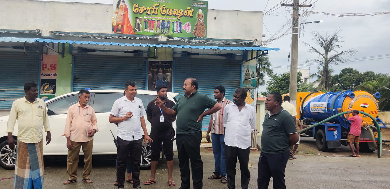 தூத்துக்குடி மாநகராட்சி வடக்கு மண்டலம் பகுதிகளில் தேங்கியுள்ள மழைநீரை உடனடியாக வெளியேற்றுவது குறித்து மேயர் ஜெகன் பெரியசாமி நேரில் பார்வையிட்டு ஆய்வு மேற்கொண்டார்.
