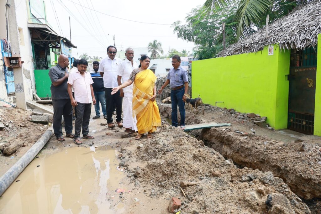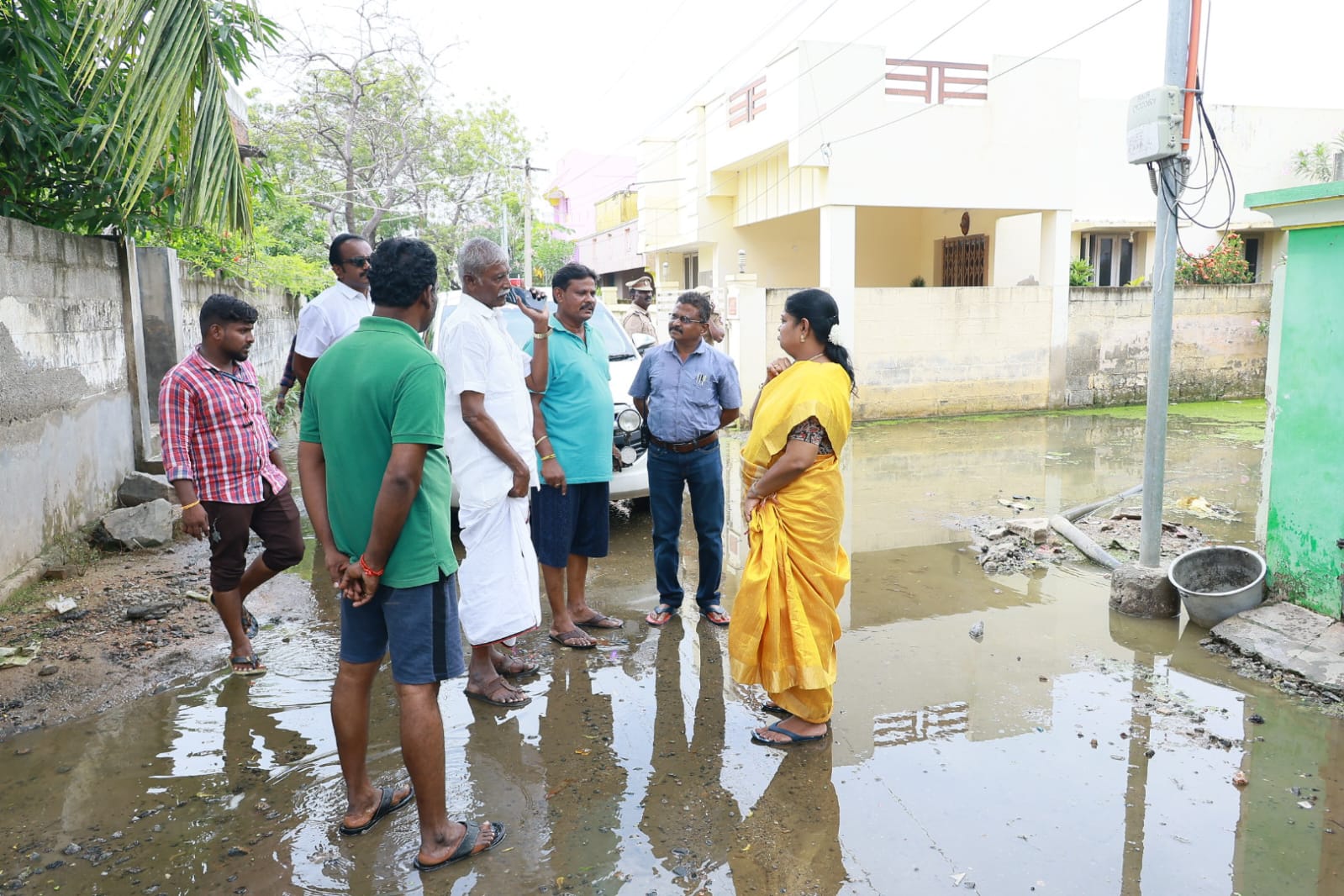 தூத்துக்குடி மாநகராட்சி 17வது வார்டுக்குட்பட்ட அன்னை தெரசா நகர், ஹரிராம் நகர், ராஜீவ்நகர் மற்றும் 18வது வார்டுக்கு உட்பட்ட ராஜகோபால் நகர் உள்ளிட்ட பகுதிகளில் மழைநீர் தேங்கிய இடங்களை வடக்கு மாவட்ட திமுக செயலாளரும் சமூகநலன் மற்றும் பெண்கள் உரிமைத்துறை அமைச்சருமான கீதாஜீவன் நேரில் ஆய்வு செய்ததுடன், மழைநீரை வெளியேற்றும் நடவடிக்கைகளை உடனடியாக மேற்கொள்ள துரிதப்படுத்தினார்.