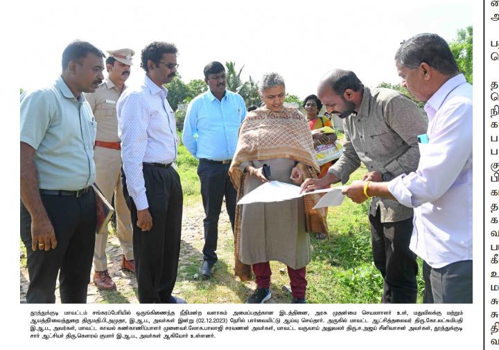 அதனால் புறநகர் பகுதியில் ஓருங்கிணைந்த நீதிமன்றம் அமைக்கப்பட வேண்டும் என்று ஏற்கனவே வடக்கு மாவட்ட திமுக செயலாளர் சமூகநலன் மற்றும் பெண்கள் உரிமைத்துறை அமைச்சர் கீதாஜுவன், மேயர் ஜெகன் பெரியசாமி ஆகியோரை நேரில் சந்தித்து வழக்கறிஞர்கள் கோரிக்கை மனு அளித்திருந்தனர். இதற்கிடையில் மாவட்ட நீதிமன்ற கண்காணிப்பு நீதிபதிகளிடமும் மனு அளித்திருந்த நிலையில் மாநகராட்சிக்குட்பட்ட புறநகர் சங்கரப்பேரியில் ஒருங்கிணைந்த நீதிமன்ற வளாகம் அமைய உள்ள இடத்தினை அரசின் மதுவிலக்கு மற்றும் ஆயத்தீர்வைத்துறை முதன்மை செயலாளர் அமுதா பார்வையிட்டு ஆய்வு செய்தார்.