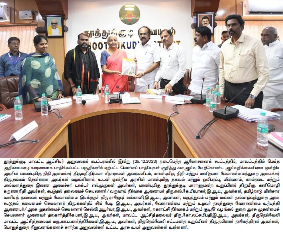 ஒன்றிய அரசின் நிதியமைச்சர் நிர்மலா சீதாராமன், நிதி மற்றும் மனிதவள மேலாண்மைத்துறை அமைச்சர் தங்கம் தென்னரசு முன்னிலையில் கலெக்டர் அலுவலக கூட்டரங்கில், தூத்துக்குடி மாவட்டத்தில் பெய்த அதிக கனமழையின் காரணமாக பாதிக்கப்பட்ட பகுதிகளில் ஏற்பட்ட வெள்ளப் பாதிப்பு குறித்து அரசு உயர் அலுவலர்களுடன் ஆலோசனை மேற்கொண்டார்.