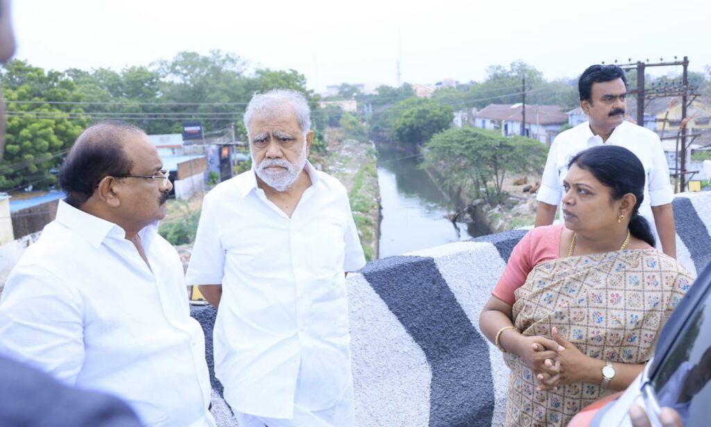 இந்நிலையில் வடக்கு மாவட்ட திமுக செயலாளரும் சமூகநலன் மற்றும் பெண்கள் உரிமைத்துறை அமைச்சர் கீதாஜீவன் மற்றும் அமைச்சர்கள் ஐ.பெரியசாமி, சக்கரபாணி ஆகியோர் தூத்துக்குடி 3ம் மைல், பக்கிள் ஓடை, திரு.வி.க.நகர், வேம்படி இசக்கியம்மன் கோவில் ஆகிய பகுதிகளில் தேங்கி நிற்கும் வெள்ளநீரை வெளியேற்றும் பணியை நேரில் ஆய்வு மேற்கொண்டு அப்பகுதியில் தேங்கியுள்ள மழைநீரை பக்கிள் ஓடை மற்றும் கால்வாய் பகுதிகளுக்கு செல்லும் வகையில் தேவையான இடங்களில் சாலைகள் தோண்டப்பட்டு கால்வாய் அமைத்து தேங்கியுள்ள மழைநீரை மோட்டர் பம்ப் மூலம் வெளியேற்றப்பட்டு வருவதை பார்வையிட்டார்கள்.