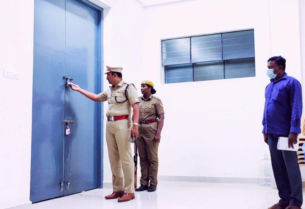 இந்நிலையில் மின்னணு வாக்கு இயந்திரங்கள் வைக்கப்பட்டுள்ள அறையின் பாதுகாப்பு ஏற்பாடுகளான சிசிடிவி கேமராக்கள் – கள், சுற்று சுவர்கள் அமைப்பு, பாதுகாப்பு அறையில் வைக்கப்பட்டுள்ள சீல்கள் முறையாக உள்ளனவா மற்றும் பாதுகாப்பு காவலர்களை நேரில் சென்று அரியலூர் மாவட்ட போலீஸ் சூப்பிரண்டு பாஸ்கரன் 14.03.2021 நேற்று இரவு ஆய்வு செய்தார்.